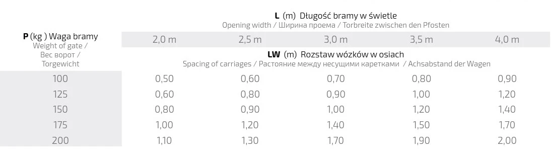 Die obige Tabelle zeigt den empfohlenen Achsabstand der Laufwagen (LW) in Metern, abhängig vom Torgewicht (P) und der lichten Torbreite (L). Die korrekte Wahl des Abstands ist entscheidend für eine gleichmäßige Lastverteilung und die Langlebigkeit des gesamten Laufsystems: