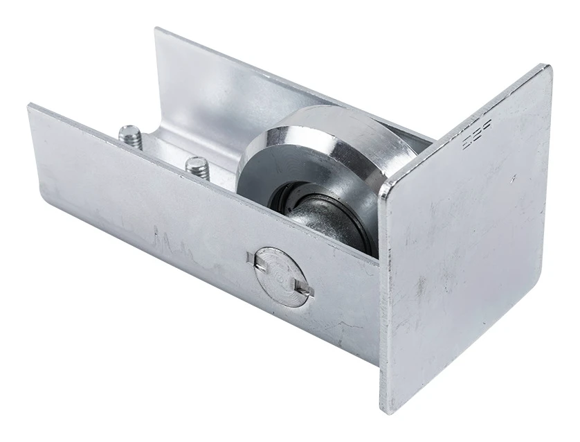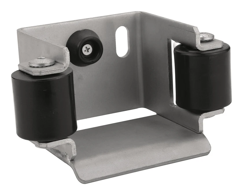 Der Stahl-Einlaufhalter wird am Pfosten montiert und stabilisiert das Tor im geschlossenen Zustand, während er gleichzeitig das Torgewicht auf zusätzliche Konstruktionselemente verteilt. Zwei Führungsrollen aus Kunststoff sorgen für eine präzise Torführung und reduzieren den Verschleiß der Laufwagen.