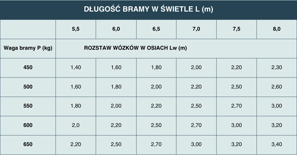 Der optimale Abstand der Laufwagen hängt von der lichten Torbreite und dem Torgewicht ab. Die folgende Tabelle erleichtert die schnelle Auswahl des optimalen Laufwagenabstands in der Achse (Lw) für Tore mit einer Breite von 5,5 m bis 8,0 m und einem Gewicht von 450 kg bis 650 kg.