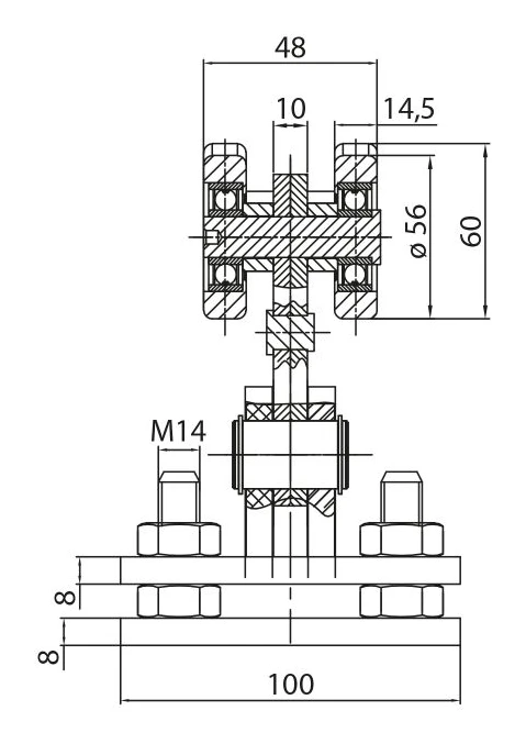Die Maßzeichnung zeigt einen Schnitt des Laufwagens mit den wichtigsten Abmessungen. Die zweireihige Rollenanordnung sorgt für optimale Kraftverteilung, und die doppelte Grundplatte mit M14-Schraubenregulierung ermöglicht eine präzise Einstellung von Höhe und Lot des Torflügels nach der Montage.