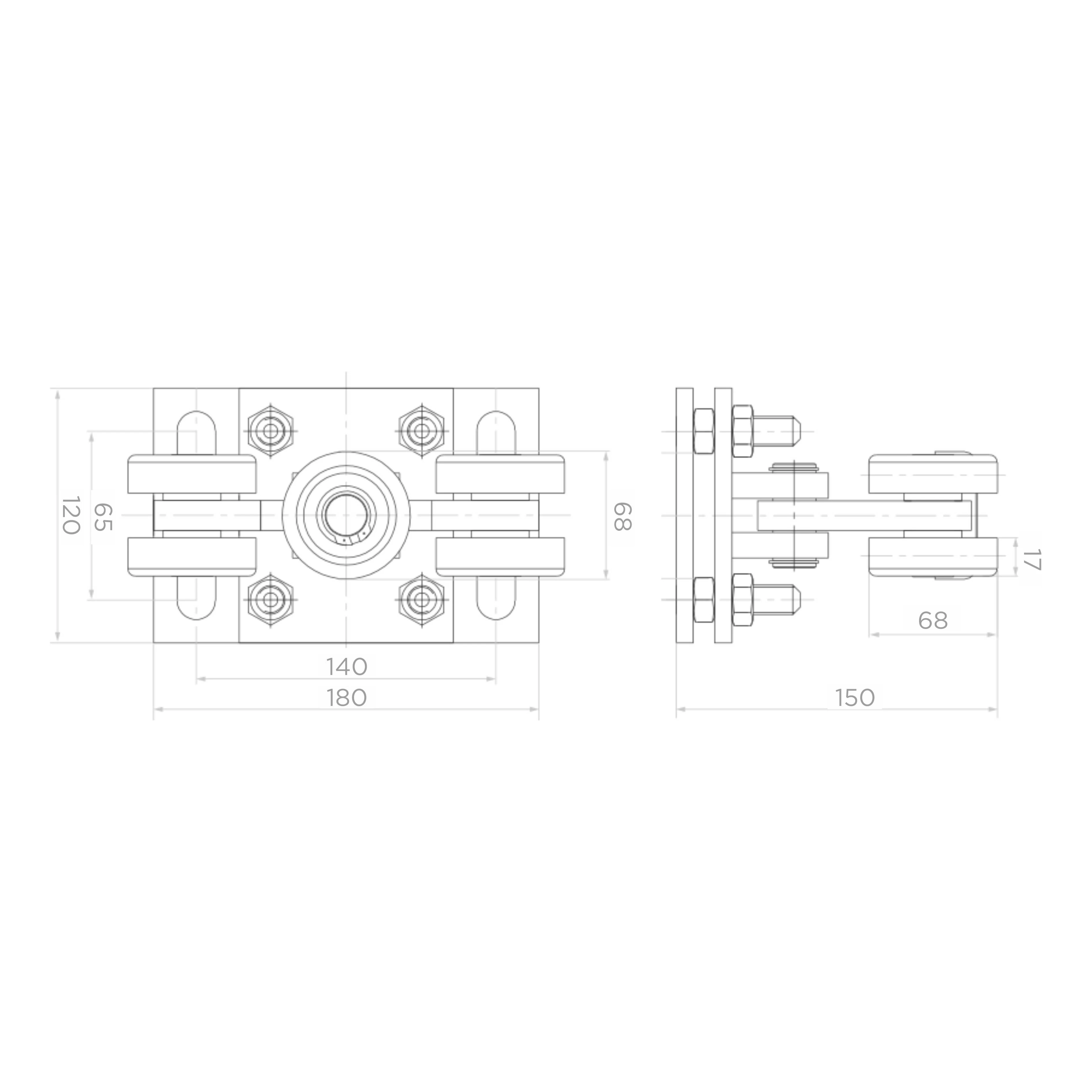 Der Laufwagen ist mit 5 Metallrollen ausgestattet, darunter eine horizontale Rolle für zusätzliche Führungsstabilität des Tores. Pendelnd aufgehängte Konstruktion – der Laufwagen ist über einen Zapfen mit der Basis verbunden, wodurch er sich automatisch an die Schiene des Schiebetors anpasst. Die Höhenverstellung mittels Schrauben ermöglicht eine präzise Einstellung des Tores während der Montage.
