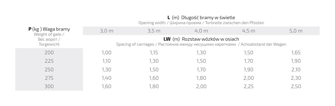 Der korrekte Laufwagenabstand (LW) hängt von der lichten Torbreite (L) sowie dem Torgewicht (P) ab. Die folgende Tabelle zeigt die empfohlenen Laufwagenabstände in Metern, die einen optimalen Betrieb und eine lange Lebensdauer des Systems gewährleisten: