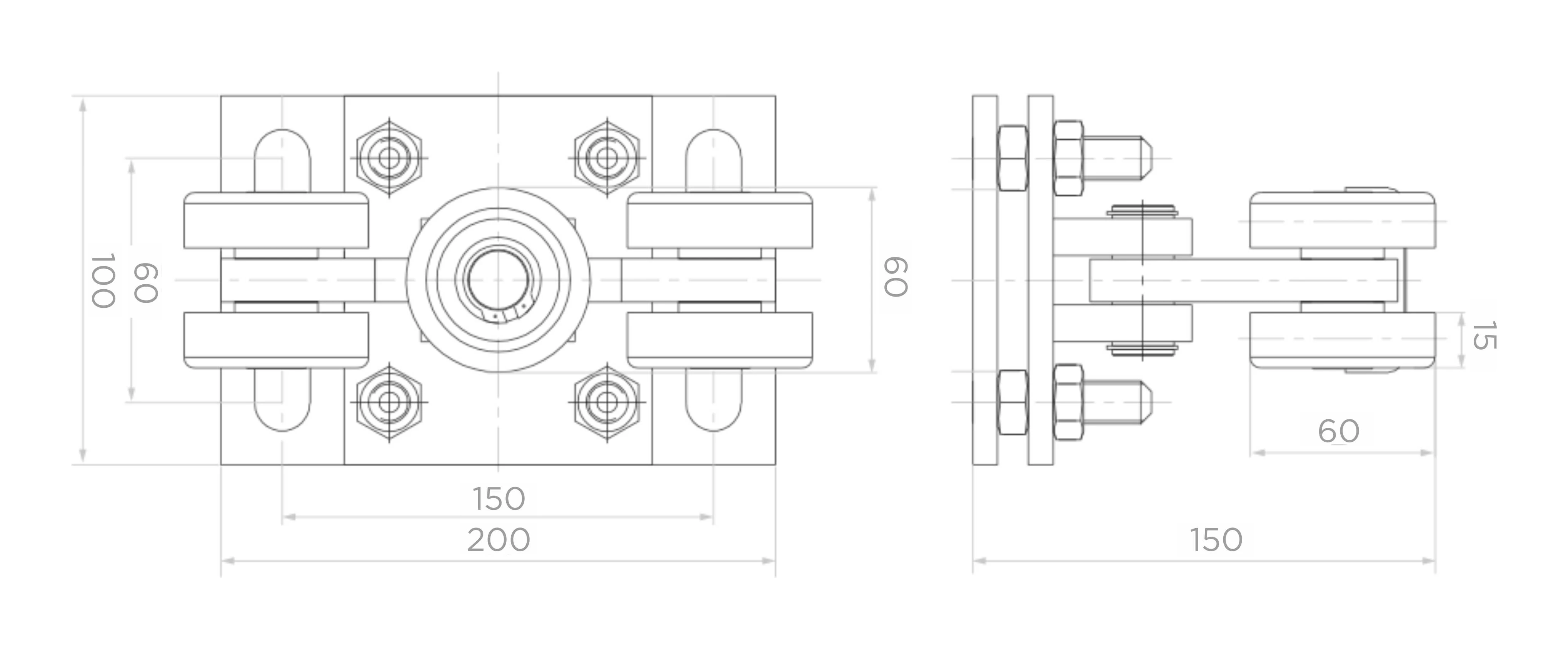 Der Laufwagen ist mit 5 Metallrollen ausgestattet, darunter 1 Horizontalrolle, die eine stabile Führung des Tores auf der Schiene gewährleisten. Die Pendelkonstruktion — der Laufwagen ist über einen Bolzen mit der Grundplatte verbunden — ermöglicht eine automatische Anpassung an das Schiebetor und gleicht eventuelle Unebenheiten und Abweichungen der Schiene aus. Die Höhe des Laufwagens ist per Schrauben einstellbar, was eine präzise Ausrichtung des Tores während der Montage erleichtert.