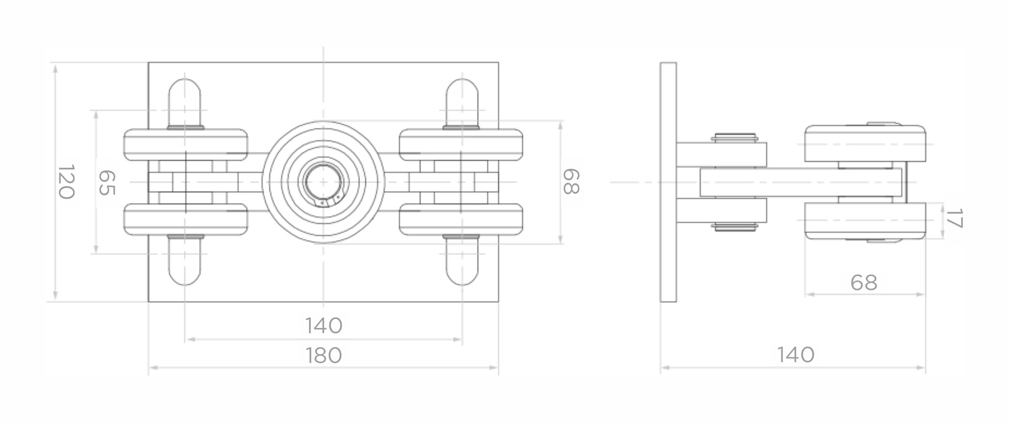 Der Laufwagen ist kompatibel mit einer Laufschiene mit dem Querschnitt 80 × 80 × 5 mm. Die stabile, massive Grundplatte mit Langlöchern (Bohrlochpaaren) ermöglicht eine präzise Positionierung des Laufwagens auf dem Fundament, was die Montage beschleunigt und die Ausrichtung der Laufbahn erleichtert.
