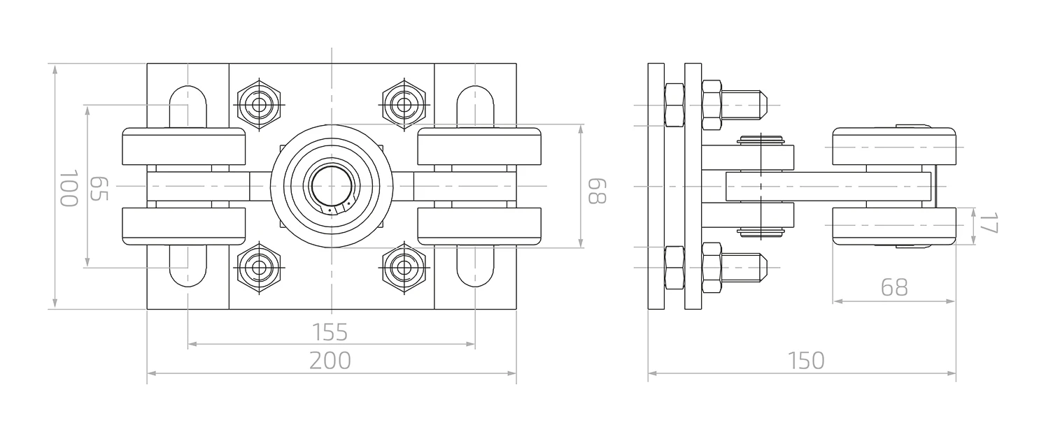Der Laufwagen ist mit 5 Stahlrollen ausgestattet — vier vertikal angeordneten Tragrollen sowie einer horizontalen Führungsrolle. Diese Anordnung gewährleistet eine stabile Abstützung der Torschiene sowohl von unten als auch seitlich, was einen leisen Betrieb und minimalen Verschleiß der Laufelemente sicherstellt. Der Laufwagenkorpus ist über einen Pendelzapfen mit der Grundplatte verbunden, sodass das gesamte Rollensystem schwenken und eventuelle Montagetoleranzen ausgleichen kann. Die Höhenregulierung erfolgt über kontergesicherte Schrauben — damit lässt sich die Schienenhöhe relativ zu den Torpfosten präzise einstellen, ohne Distanzstücke unterlegen zu müssen.