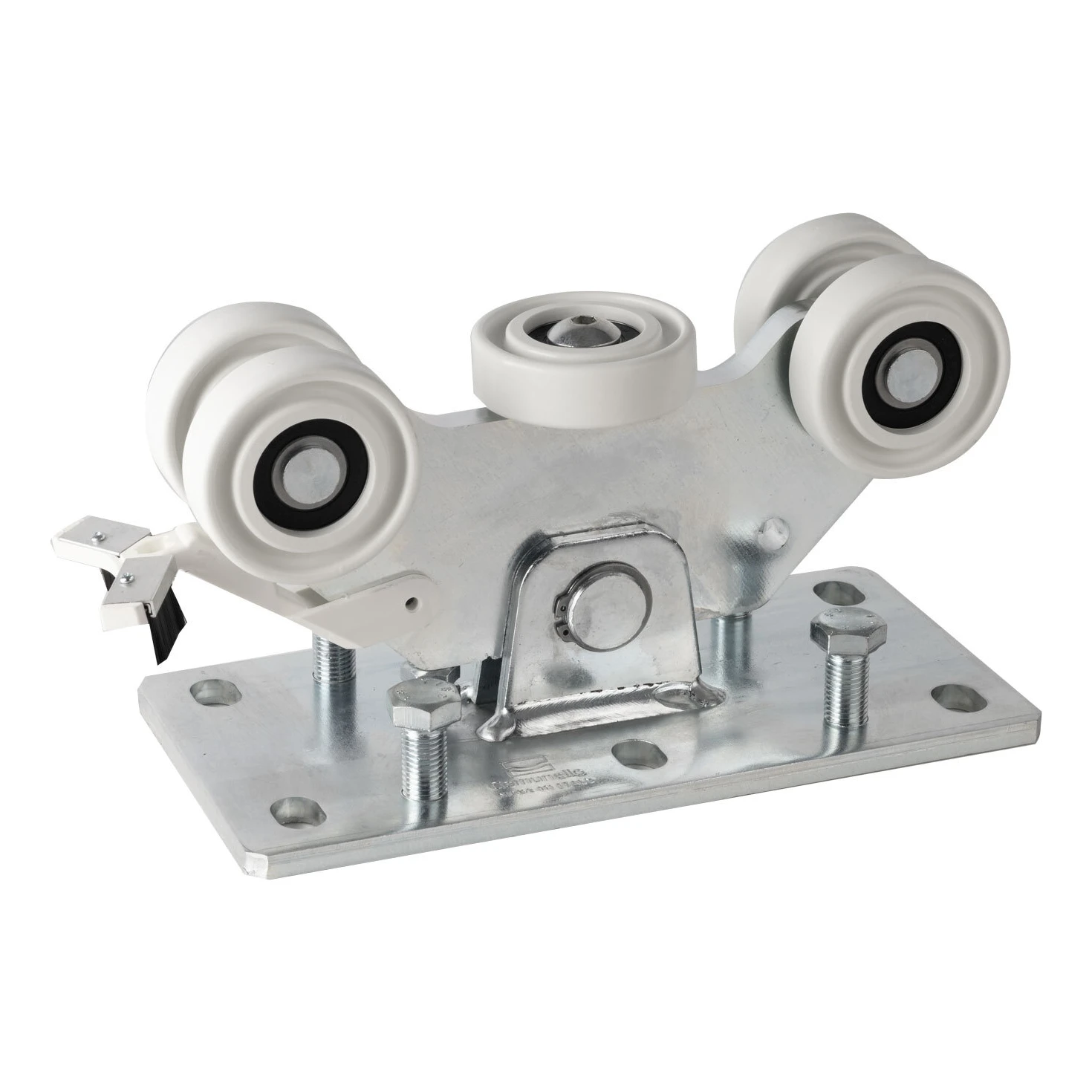 Der Laufwagen besteht aus einer massiven Montageplatte, die am Torunterbau befestigt wird, sowie einem Gehäuse mit fünf Rollen – drei tragenden Hauptrollen und zwei seitlichen Führungsrollen. Die auf Lagern montierten Nylonrollen gewährleisten einen gleichmäßigen Lauf auch bei hohen Belastungen. Ein Klemmelement (Klips) ermöglicht die sichere Fixierung der Torführungsschiene im Laufwagensitz. Dank der durchdachten Konstruktion ist die Montage schnell und erfordert kein Spezialwerkzeug – die Montageplatte wird einfach mit Schrauben durch die Montagelöcher am Unterbau befestigt.