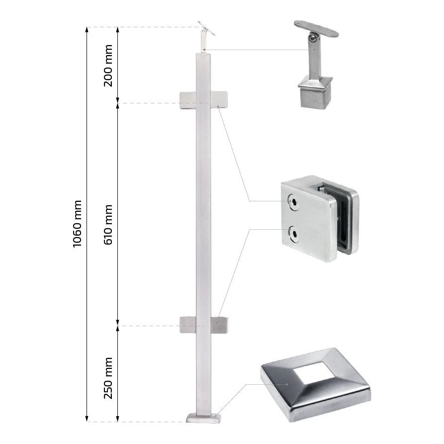 Mittlerer Geländerpfosten aus Edelstahl AISI 304 mit Profil 40×40 mm und Höhe 1060 mm — komplettes Set mit vier Glashaltern, Handlaufhalterung, Abdeckkappe und Gummis. Das satinierte Finish verleiht ein elegantes, modernes Aussehen, das sowohl zu Balkon- als auch zu Treppengeländern perfekt passt. Die solide Konstruktion und präzise Verarbeitung ermöglichen eine schnelle, professionelle Montage.