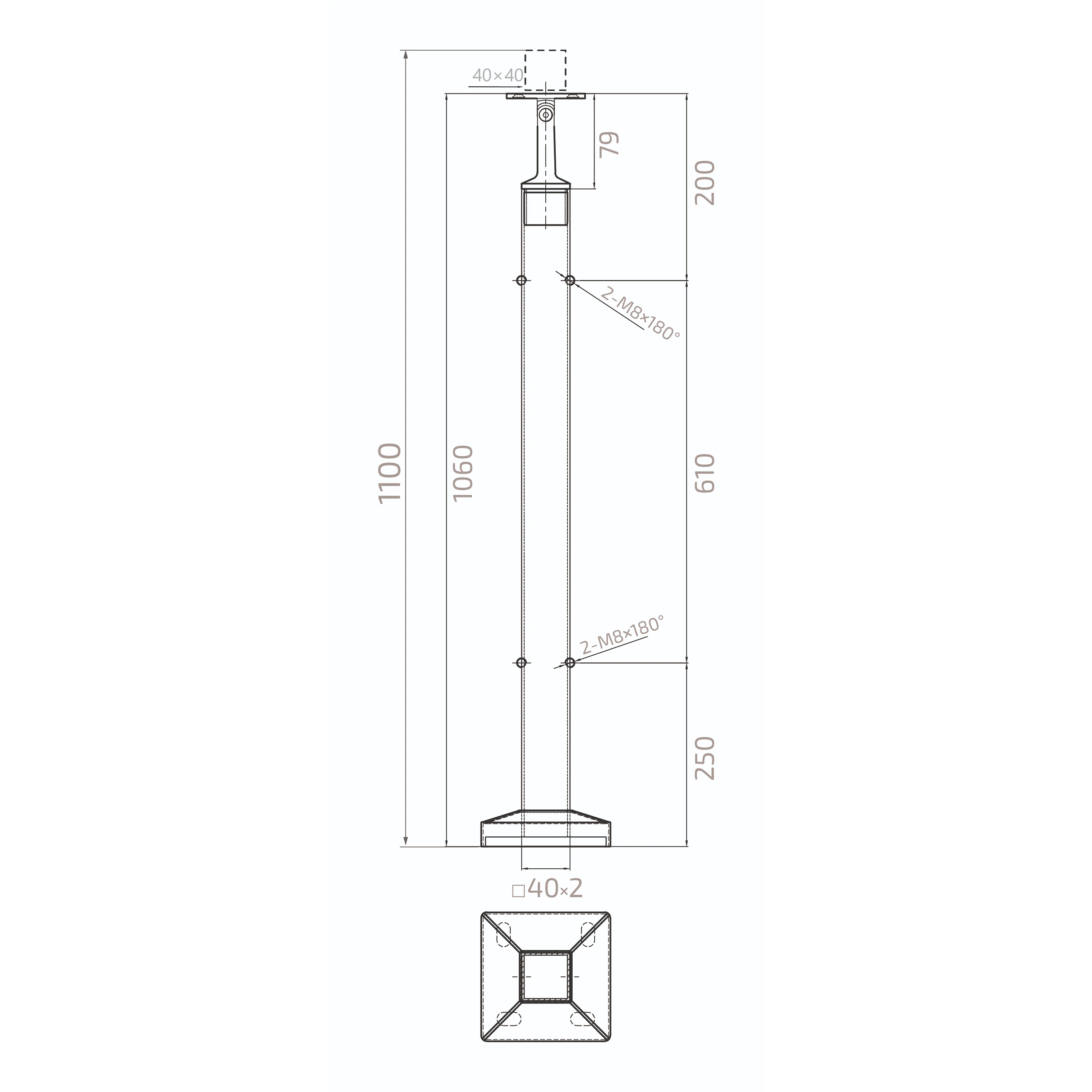 Der Pfosten ist zur Bodenmontage als mittleres Element des Geländers vorgesehen. Die Gesamthöhe der Konstruktion mit Handlauf beträgt 1100 mm, was den Standardanforderungen für Geländer entspricht. Die Handlaufhalterung ist nicht dauerhaft verklebt — die Montage erfolgt mit anaeroben Klebstoff für Edelstahl, was volle Einstellungsfreiheit und die Möglichkeit einer Pfostenkürzung bei Bodenunebenheiten bietet. Die auf zwei Ebenen montierten Halter (Abstand 610 mm) ermöglichen ein sicheres Halten von gehärtetem oder laminiertem Glasscheiben.