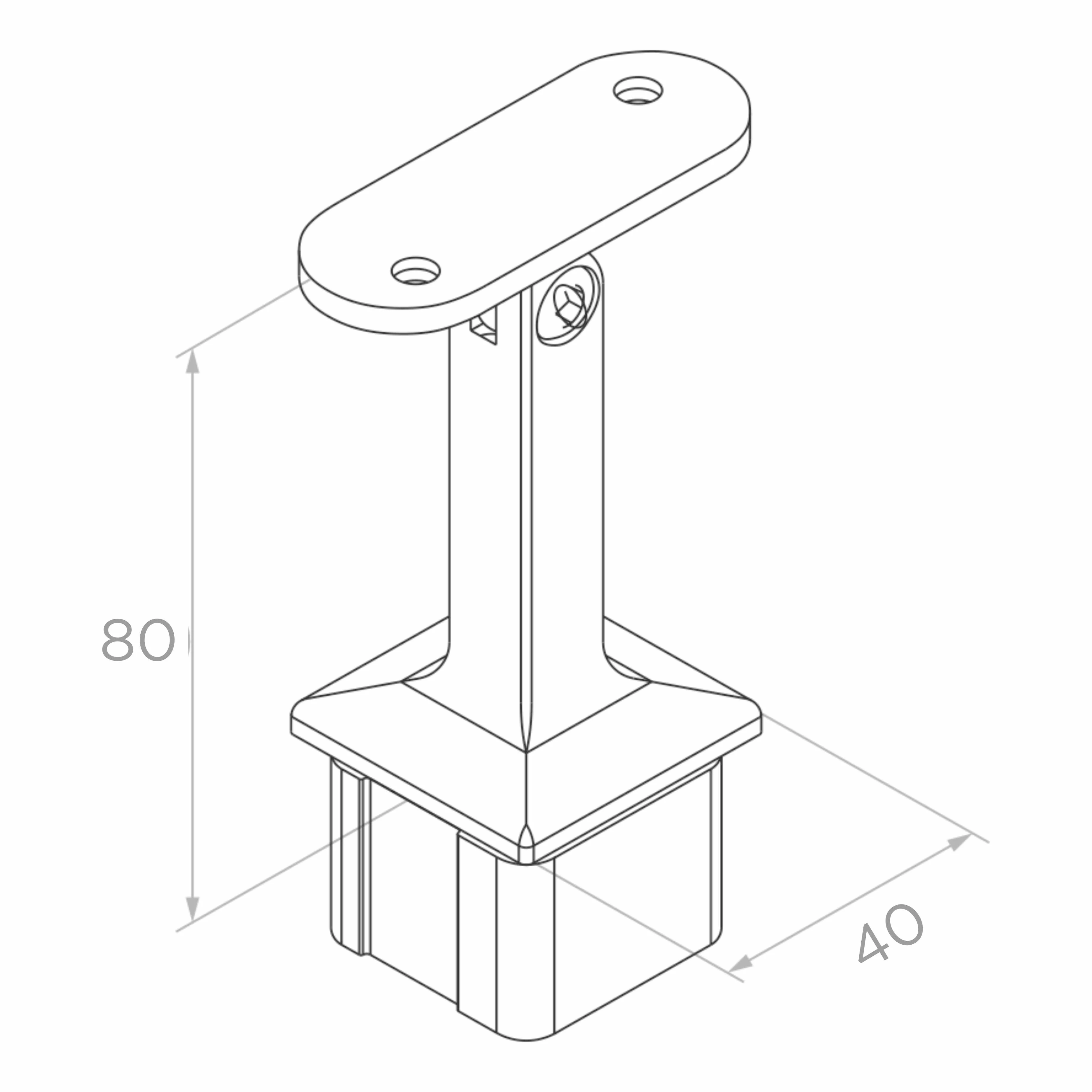Handlaufhalterung mit Höhe 80 mm und Basis angepasst an Profil 40×40 mm — wird von oben auf den Pfosten mit anaeroben Klebstoff montiert. Die verstellbare Oberplatte ermöglicht eine präzise Einstellung des Handlaufneigungswinkels.