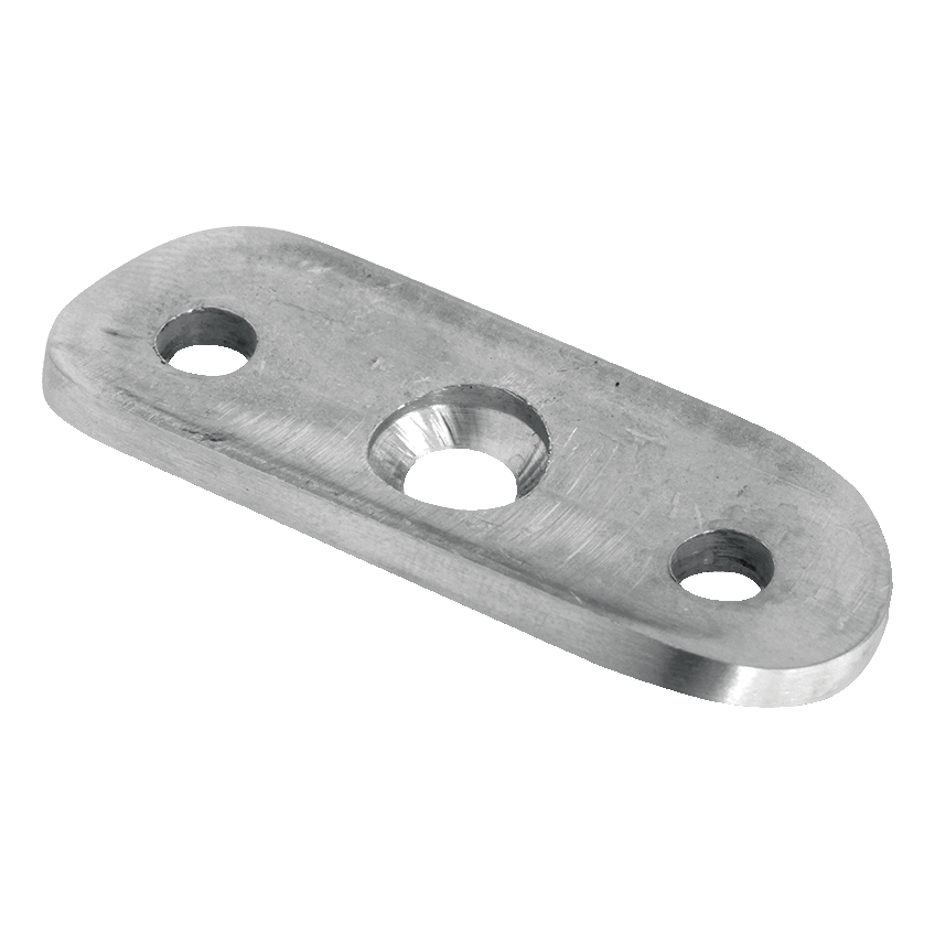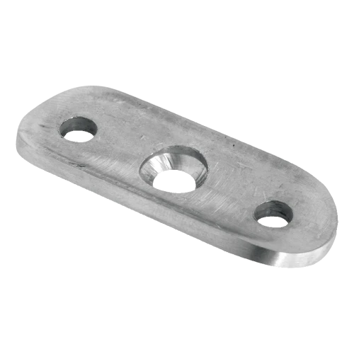 Montageplatte für Handlauf für Geländersystem Ø 48,3 mm. Ermöglicht schnelle und sichere Montage des Handlaufs von oben, direkt auf ebene Fläche – z.B. an Geländerpfosten oder andere tragende Elemente. Drei Montagelöcher (zwei äußere angefast für Senkkopfschrauben und ein mittiges) gewährleisten stabile, dreipunktige Befestigung und ästhetisches Erscheinungsbild der Verbindung.