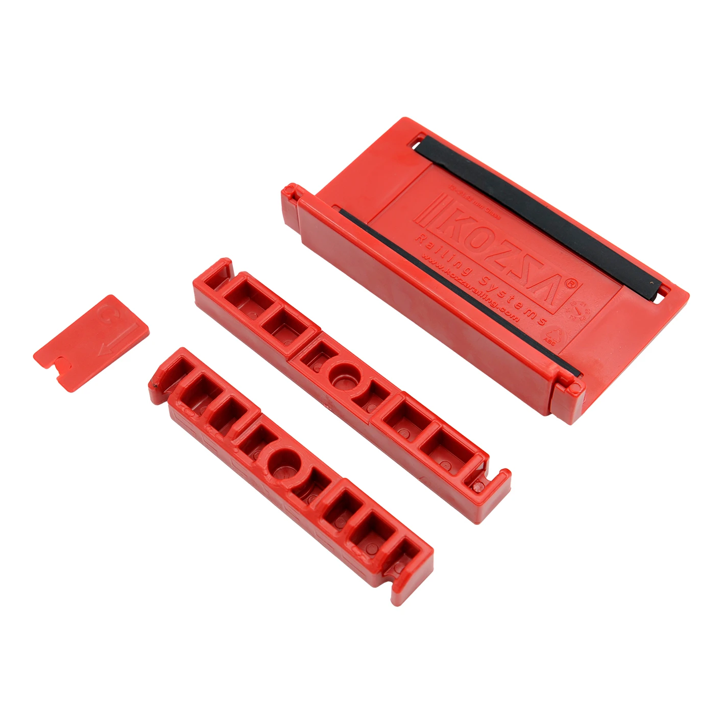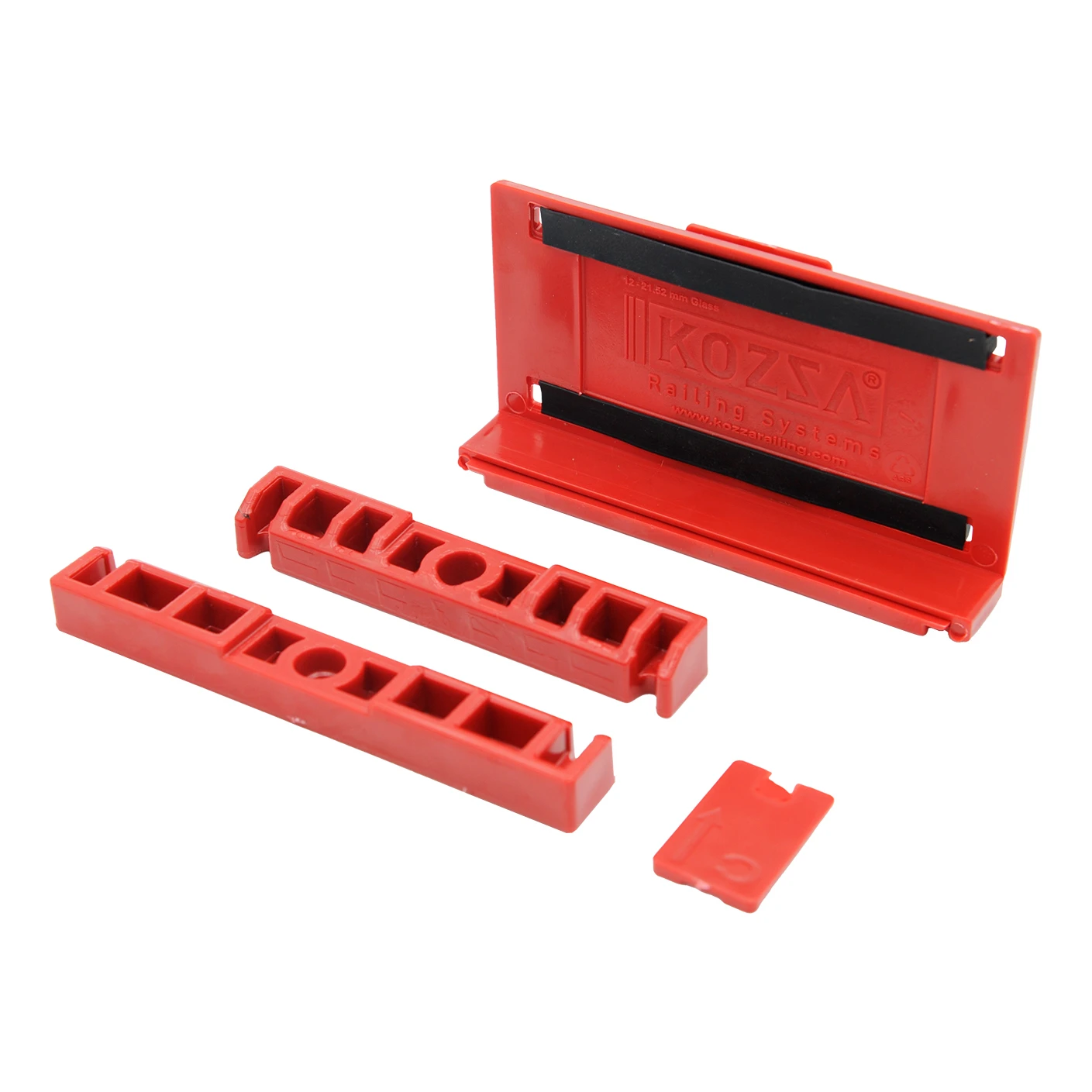 Das Set enthält spezielle Kunststoff-Montageelemente, die eine sichere und reproduzierbare Positionierung der Scheibe über die gesamte Profillänge gewährleisten. Jedes Komplett-Set besteht aus einem Hauptstabilisierungselement, zwei Seitenführungen und einem Sicherungsclip – insgesamt 20 Komplett-Sets im Lieferumfang, ausreichend für ein 5 Meter langes Profil.