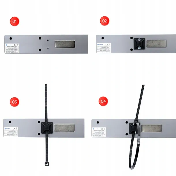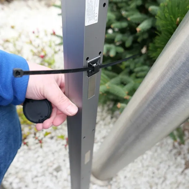 Montageanleitung mit Kabelbinder-Adapter: An den Löchern im Gehäuse befestigen wir die Kunststoffhalterung mit zwei Schrauben, anschließend ziehen wir den Kabelbinder durch die Öffnungen der Halterung und schließen ihn um den Pfosten oder das Rohr.