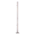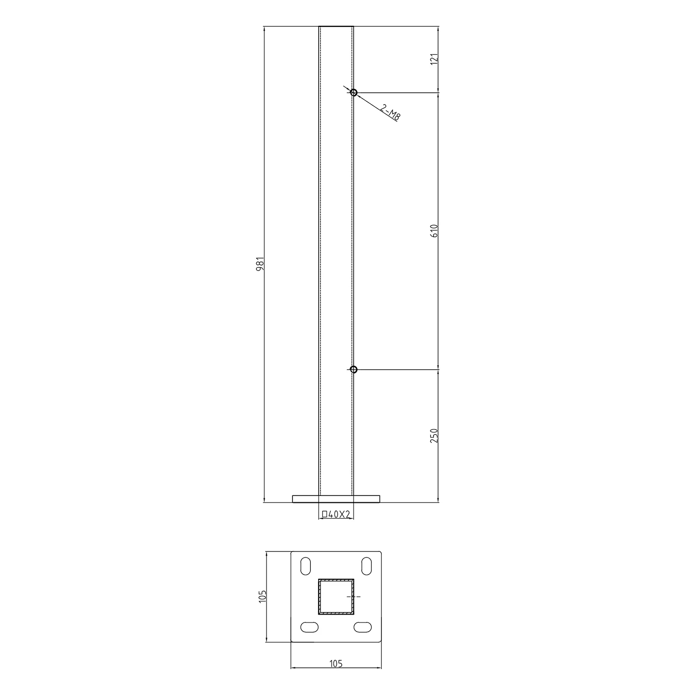 Der Pfosten wird direkt am Boden mittels angeschweißter Fußplatte mit den Abmessungen 105×105 mm und vier Langlöchern montiert. Die ovale Form der Löcher (20×11 mm) ermöglicht eine Korrektur der Ausrichtung während der Montage. Zwei Gewindebohrungen M8 am Pfosten mit einem Abstand von 610 mm ermöglichen eine schnelle Befestigung von Geländerholmen ohne die Notwendigkeit von Bohren oder Gewindeschneiden auf der Baustelle.