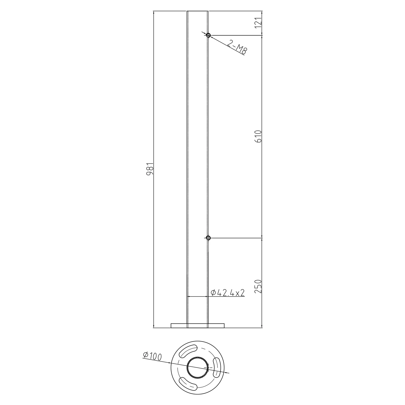 Der Pfosten verfügt über 2 Bohrungen mit Gewinde M8, die am Korpus mit einem Abstand von 610 mm angeordnet sind. Die erste Bohrung befindet sich 121 mm von der oberen Kante, die zweite — 250 mm von der unteren Kante des Pfostens. Diese Anordnung ermöglicht eine einfache und schnelle Verschraubung beliebiger Halterungen für Rohre, Stäbe oder Glas, was dem Installateur volle Kontrolle über die Geländerkonfiguration gibt.