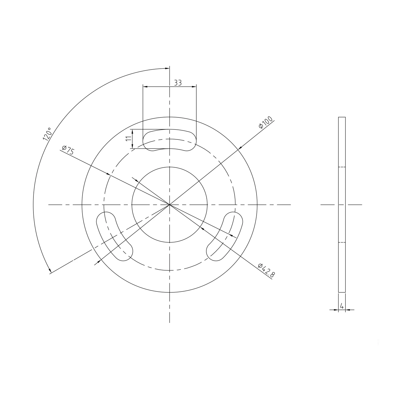 - Löcher im Flansch: 3 Stk. (Langlöcher 33 × 11 mm) auf Kreis Ø75 mm, alle 120°