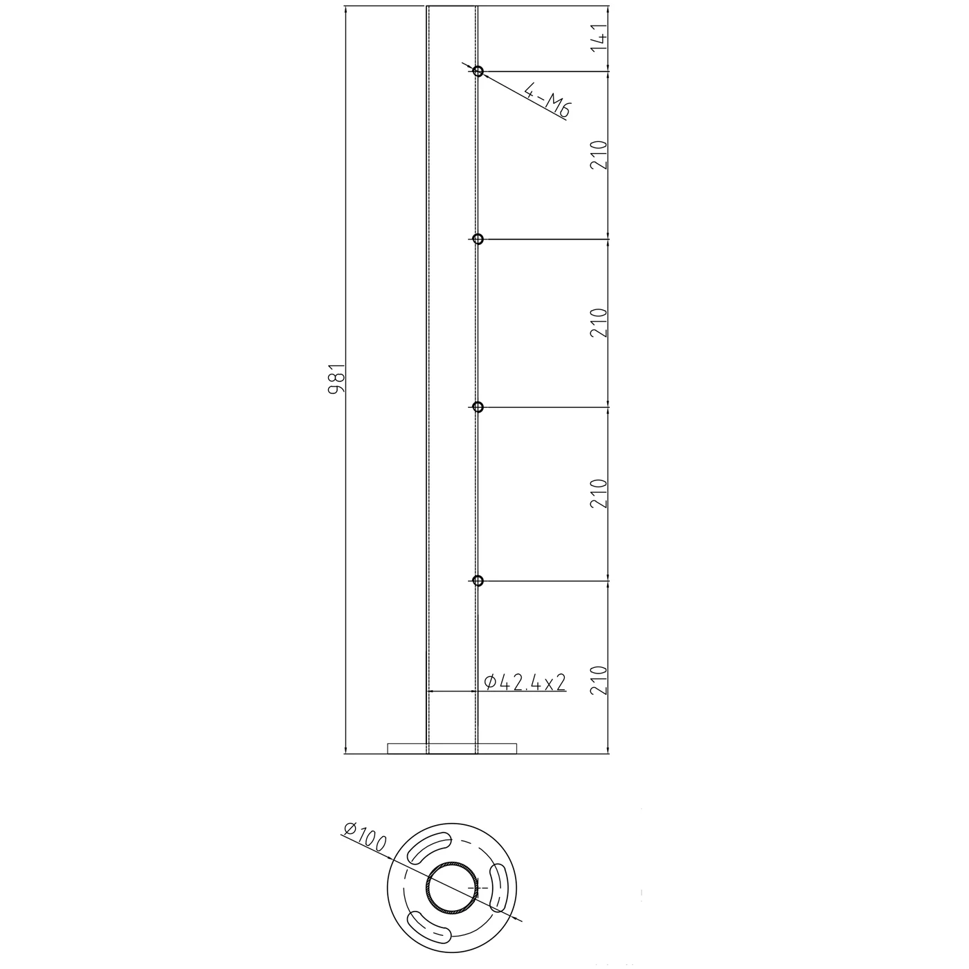 Der Pfosten ist vom Typ unbewehrt — er verfügt über 4 Löcher mit M6-Gewinde, die in gleichmäßigen Abständen von 210 mm angeordnet sind, was eine freie Auswahl und Montage beliebiger Halterungen für Stäbe, Rohre oder Füllungen ermöglicht. Dadurch hat der Installateur volle Flexibilität bei der Konfiguration des Geländers für ein spezifisches Projekt.