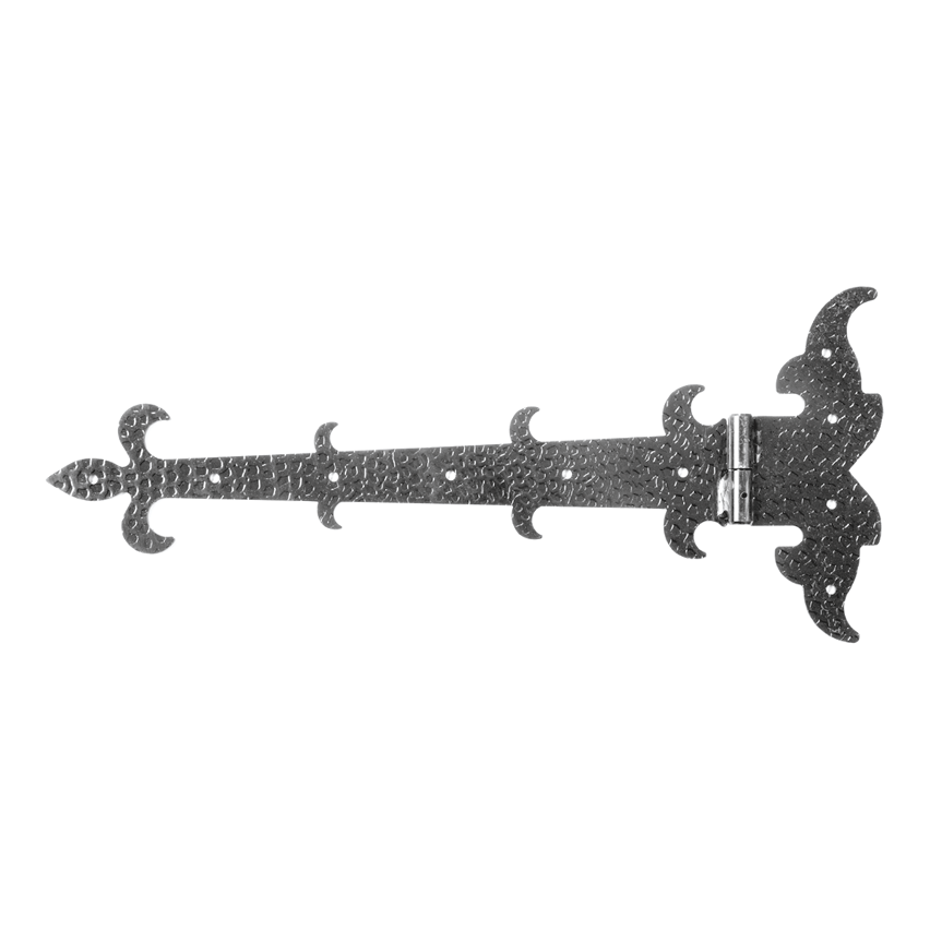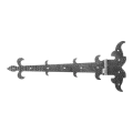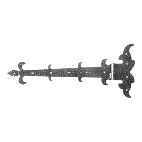 Die Ausführung aus Stahl gewährleistet hohe mechanische Festigkeit und Langlebigkeit. Die dekorativen Elemente – das Lilienmotiv am Ende des Arms sowie die ornamentalen Biegungen – machen dieses Scharnier zur perfekten Wahl für Tore und Pforten im rustikalen, ländlichen oder historisierenden Stil.