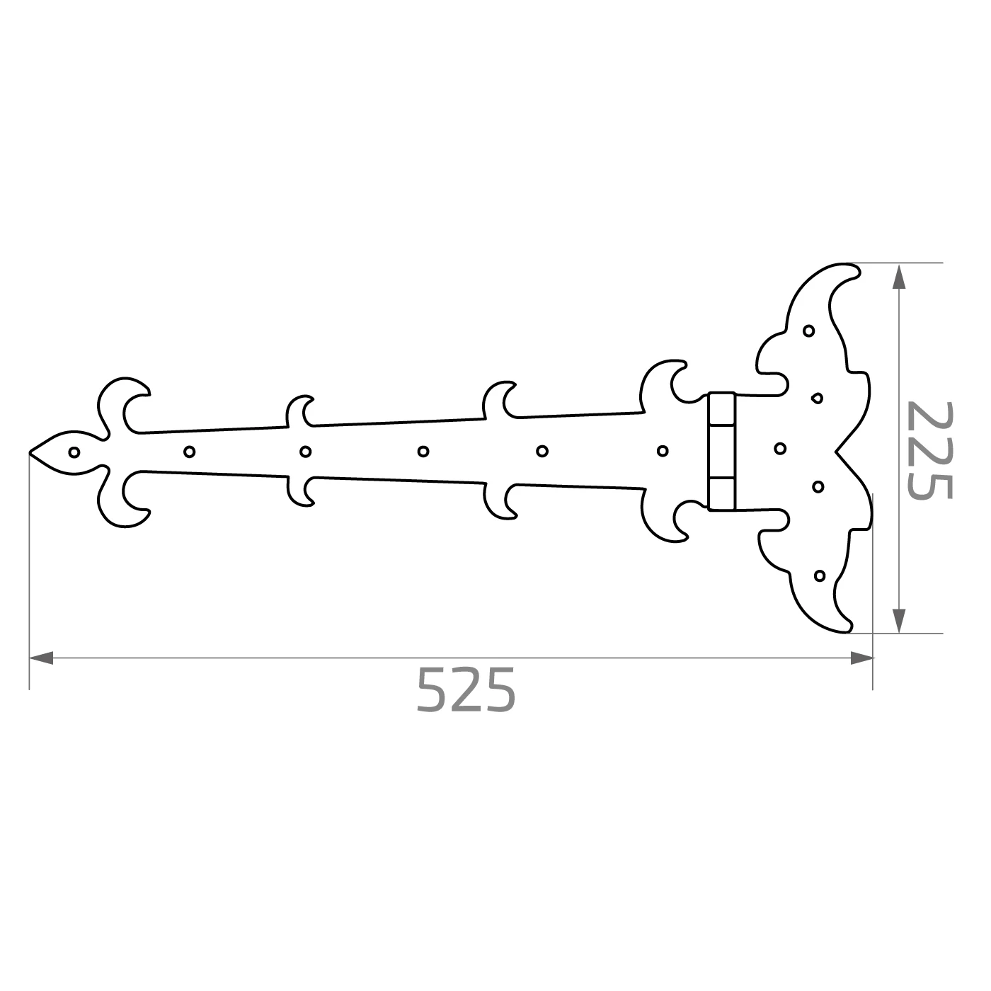 Das dekorative Zierband rechts POSTAL ist ein stählernes Beschlagelement mit dekorativem, traditionellem Design, bestimmt für die Montage an Toren, Pforten, Holztüren und anderen Konstruktionen, die eine klassische Veredelung erfordern. Durch die dekorativen Abschlüsse im Stil der heraldischen Lilie sowie die texturierte Oberfläche, die an Hämmern erinnert, verleiht das Scharnier den Objekten einen edlen, handwerklichen Charakter.