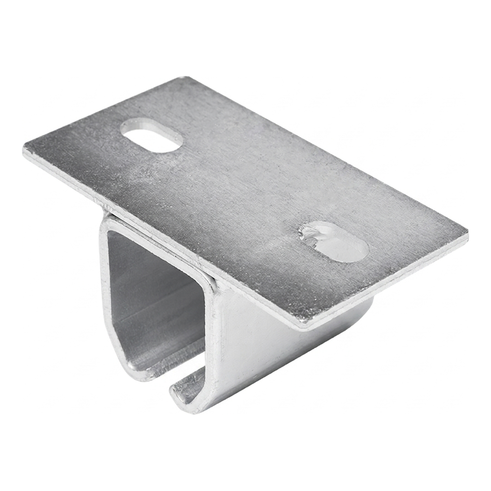 Der Aufhänger besteht aus einem breiten Montageblech mit Bohrungen zur Befestigung an Sturz oder Tragkonstruktion sowie aus einem profilierten Halter, der die Schiene von oben umschließt. Die Profilform gewährleistet eine stabile Einbettung des U-Profils und gleichmäßige Lastübertragung. Die Montagebohrungen (einschließlich einer ovalen) erleichtern die Positionsregulierung während der Installation, was die Ausrichtung der Schiene über die gesamte Torlänge beschleunigt.
