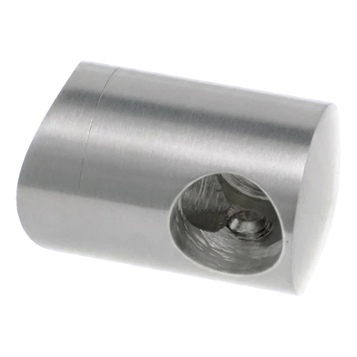 Die profilierte Basis der Haltung ist präzise an die Krümmung des Rohrs mit Durchmesser 42,4 mm angepasst, wodurch das Element dicht am Pfosten anliegt und sicher befestigt werden kann. Die kompakte, zylindrische Form mit einem Außendurchmesser von 22 mm gewährleistet ein diskretes Aussehen und dominiert visuell nicht über die Balustradenkonstruktion. Die seitliche Bohrung mit Durchmesser 12 mm nimmt den Ausfachungsstab auf, und die Montagebohrung Ø 6,5 mm ermöglicht eine stabile Verbindung mit dem Pfosten.