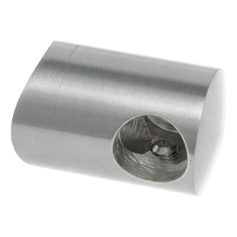 Die Haltung wird direkt am Balustradenpfosten montiert und dient als Anfangselement (endständig) einer Reihe von Ausfachungsstäben. Die profilierte Aufnahme, angepasst an Rohr Ø 42,4 mm, gewährleistet stabiles Anliegen am Pfosten ohne zusätzliche Bearbeitung. Zwei am Gehäuse sichtbare Bohrungen für Druckschrauben ermöglichen eine sichere Fixierung des Stabs in der Haltung. Das Produkt ist für professionelle Balustradensysteme aus Edelstahl konzipiert — ideal für Treppen-, Balkon- und Terrassengeländer.