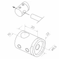 Der Halterkörper hat die Form eines Zylinders mit einer Querbohrung für den Stab. Die Montagebohrung in der Achse des Teils ermöglicht die Verschraubung des Halters an einer flachen Oberfläche (z.B. Pfosten, Profil). Die Montageansicht in der technischen Zeichnung zeigt die intuitive Art der Stabeinführung in den Halter.