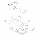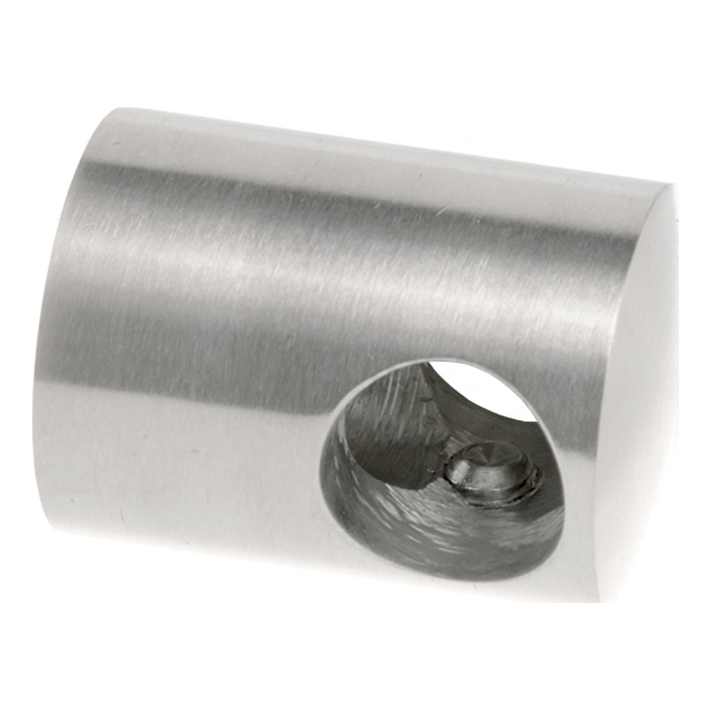 Der Halter hat die Form eines zylindrischen Korpus mit einer Durchgangsbohrung, durch die der Rundstab oder das Rohr verläuft. Die Befestigung an der Fläche erfolgt von unten über das Montageloch. Zwei seitliche Klemmschrauben ermöglichen eine sichere Fixierung des Rundstabs im Halter. Dank der kompakten Abmessungen fügt sich das Element diskret in das moderne Design von Edelstahlgeländern ein.