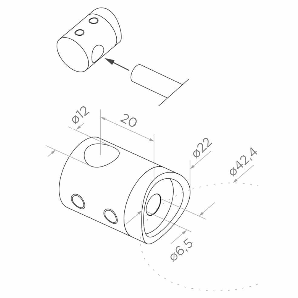 Stabhalterung: Öffnung für Rohr ø12 mm, Außendurchmesser des Gehäuses ø22 mm, Ausladung von Pfostenachse 20 mm, Montageloch ø6,5 mm, Anpassung an Pfosten ø42,4 mm.