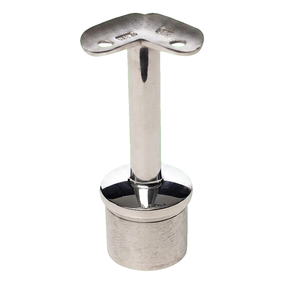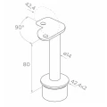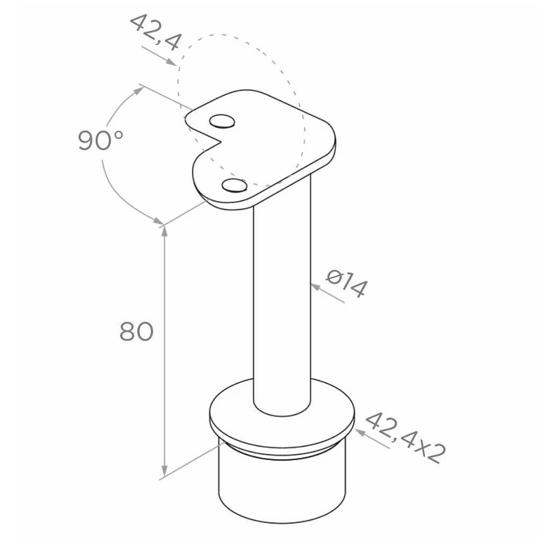 Die Stütze ist aus Edelstahl AISI 304 in polierter Ausführung (Hochglanz) gefertigt, was hohe Korrosionsbeständigkeit und elegantes Aussehen garantiert. Die Konstruktion besteht aus einer zylindrischen Basis, die an das Pfostenrohr 42,4×2 mm angepasst ist, einem Zapfen mit Durchmesser Ø14 mm sowie einer Montageplatte mit zwei Löchern, auf der der Handlauf mit Durchmesser 42,4 mm aufliegt. Die Höhe vom Pfosten zum Handlauf nach der Montage beträgt 80 mm.