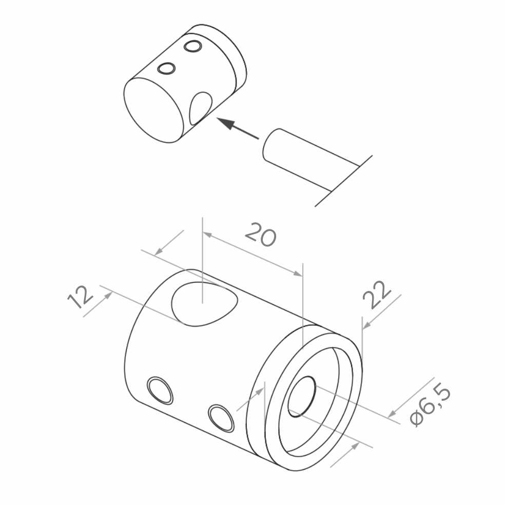 Der Halter ist für flache Systeme bestimmt — die Montage erfolgt auf der ebenen Oberfläche des Pfostens, wodurch das Element einen ästhetischen und stabilen Abschluss der Stabfüllung bildet. Die kompakte, zylindrische Form des Halters ermöglicht eine schnelle Montage und minimiert die Arbeitszeit auf der Baustelle.