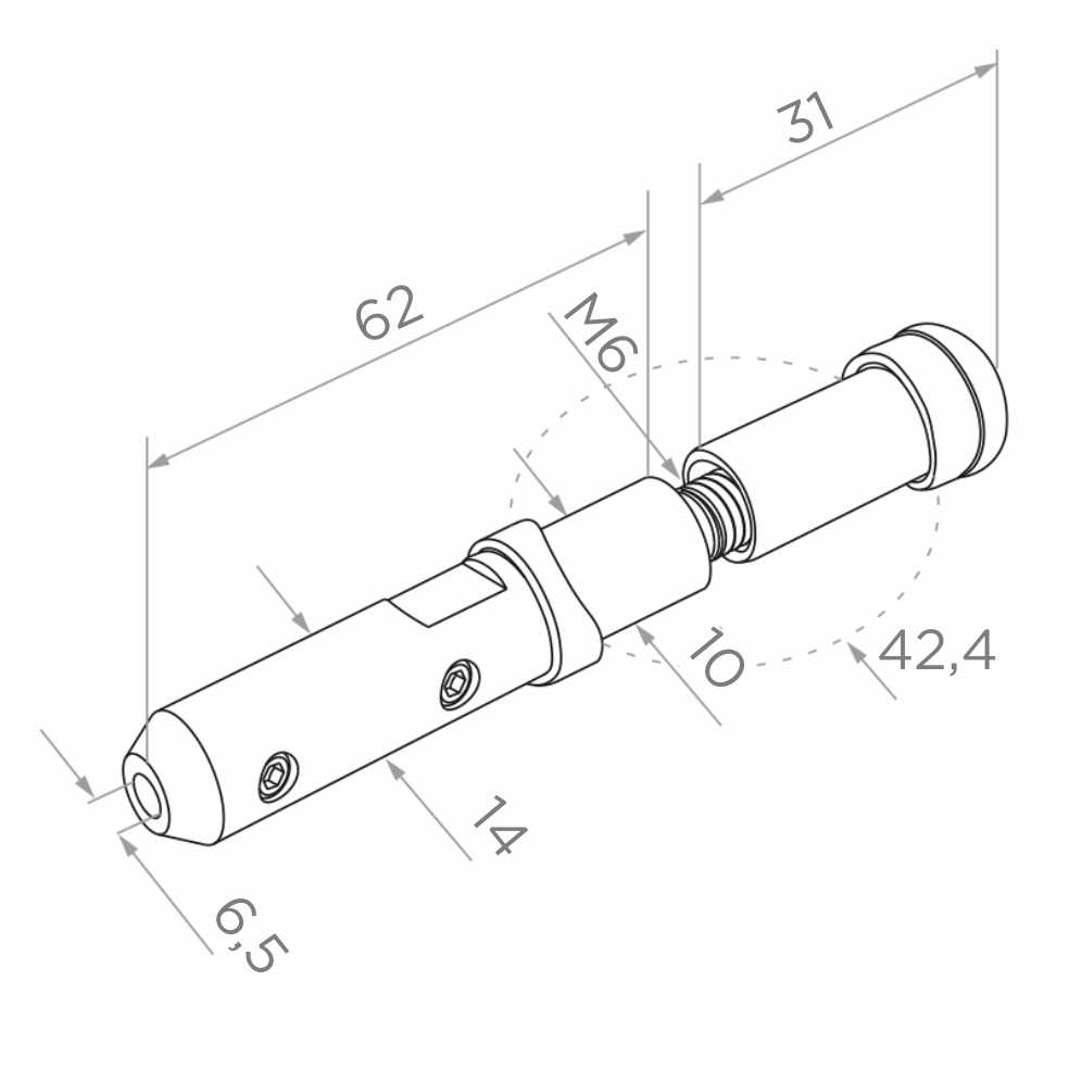 Endhalterung (Start-) für Seil Ø 6 mm bestimmt für die Montage in Seilsystemen von Stahlgeländern. Element montiert am äußersten Geländerpfosten (Rohr Ø 42,4 mm) oder direkt an einer Fläche, z.B. Wand — universelle Anwendung in einem Produkt. Dank der einschraubbaren Konstruktion mit Gewinde M6 erfordert die Halterung kein Schweißen, was die Montagezeit erheblich verkürzt und die Notwendigkeit einer Schweißausrüstung auf der Baustelle eliminiert.
