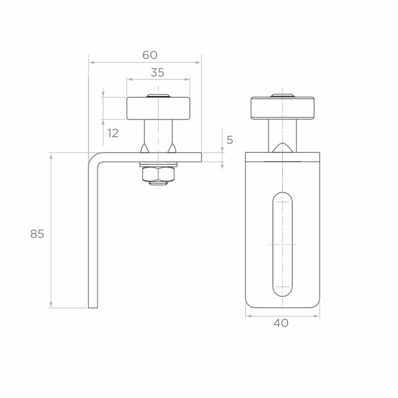 Die Führungsrolle wird am Pfosten des Schiebetores mittels des mitgelieferten Winkels montiert. Der vertikale Arm des Winkels (85 mm) wird am Pfosten befestigt, während der horizontale Arm (60 mm) in Richtung Tor ragt und die Rolle in der Achse der Fahrschiene hält. Das Langloch ermöglicht die präzise Regulierung der Höhe und Position der Rolle, was besonders wichtig beim Ausrichten des Führungs-U-Profils ist.