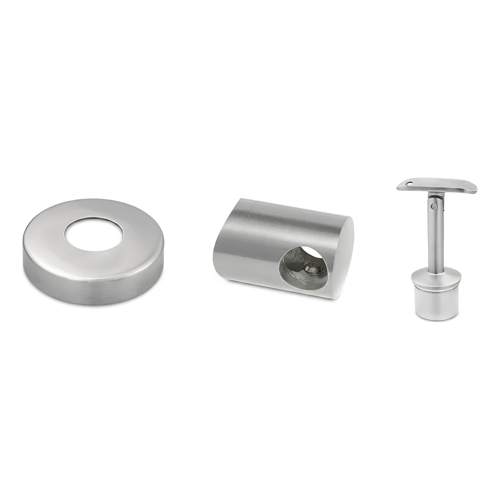 Jedes Set enthält montagebereitete Komponenten: Abdeckrosette zur Abdeckung der Pfosten durchführung durch den Boden, vier Durchgangshalterungen für Füllstäbe sowie einen verstellbaren Handlaufverbinder. Diese Elemente ermöglichen einen schnellen und ästhetischen Abschluss des Geländers ohne separate Bestellung von Zubehör.