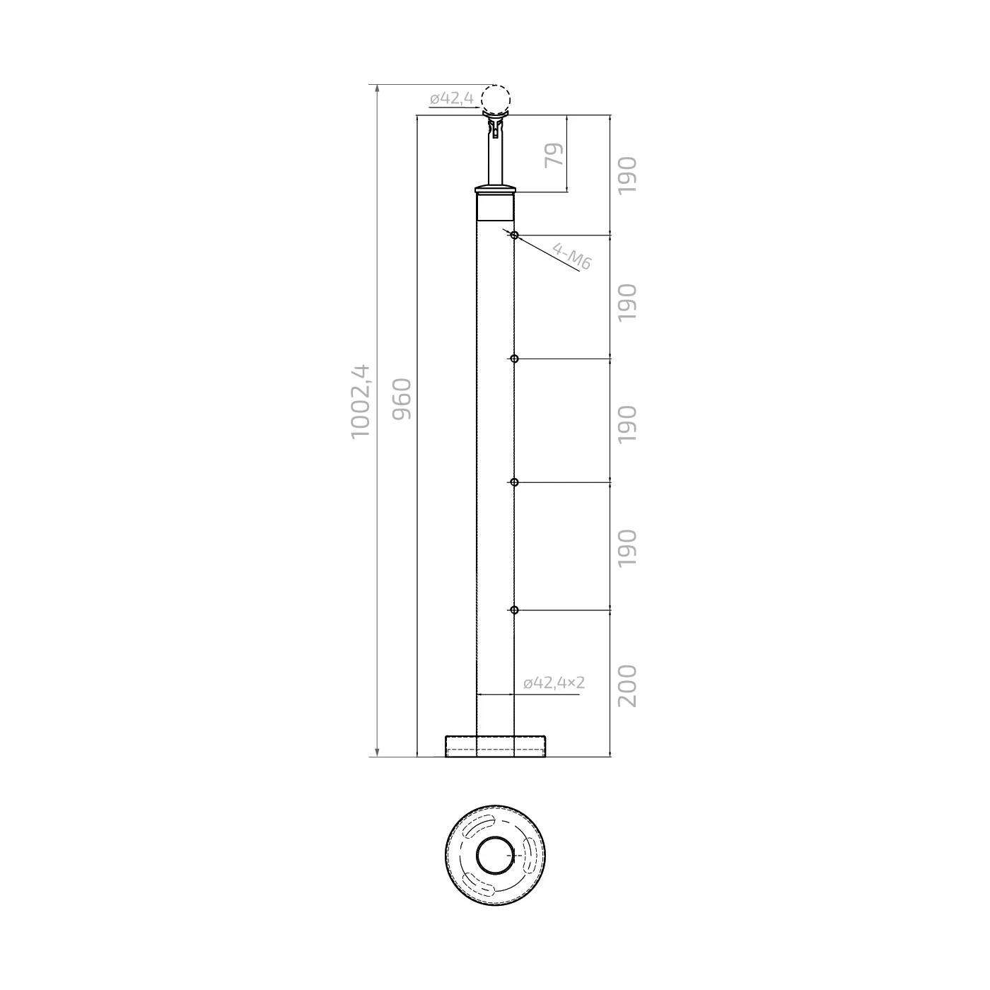Die Zeichnung zeigt die Anordnung der Durchgangshalterungen am Pfosten. Die erste Halterung ist 200 mm über dem Bodenniveau angebracht, die weiteren drei in regelmäßigen Abständen von 190 mm. Die Gesamthöhe des Rohrs beträgt 960 mm, nach Montage von Verbinder und Handlauf erreicht die Höhe 1002,4 mm.