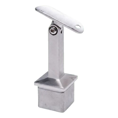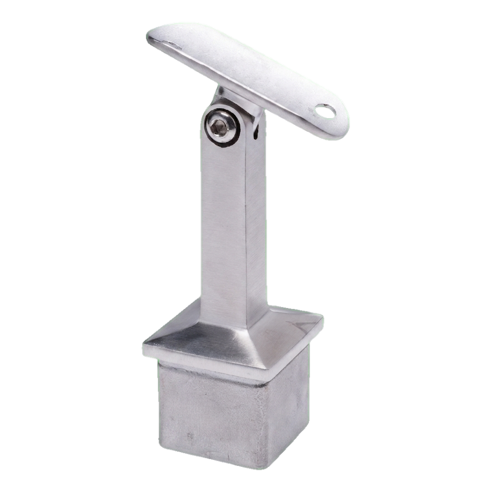 Gelenkhandlaufhalterung zur Verbindung von quadratischen Pfosten 40×40 mm mit Handläufen mit einem Durchmesser von 42,4 mm in Edelstahlgeländerkonstruktionen. Dank des verstellbaren Gelenks ermöglicht das Element die freie Einstellung des Handlaufneigungswinkels, was besonders bei der Montage von Treppengeländern nützlich ist — es entfällt die Notwendigkeit des Zuschneidens und Anpassens vor Ort.