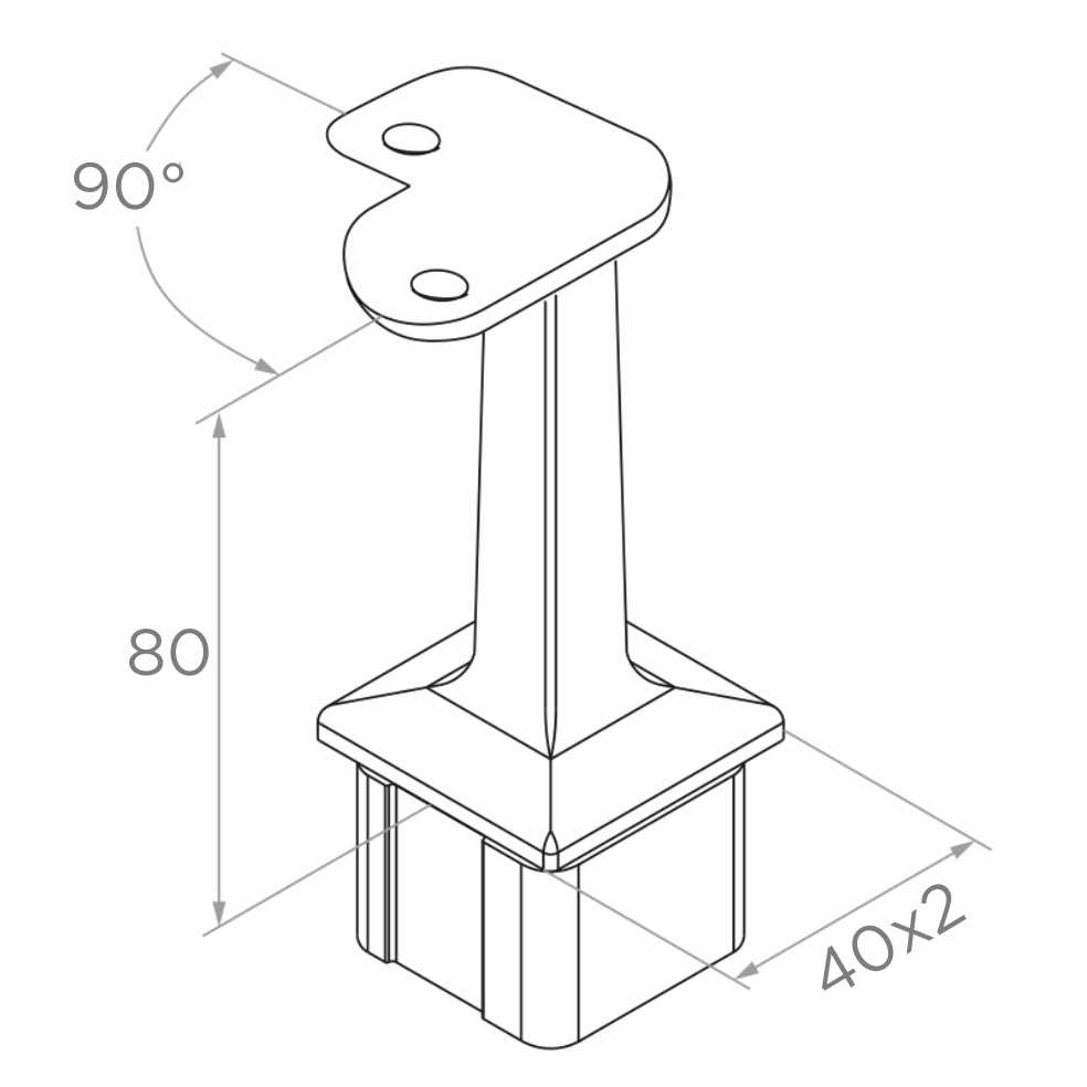 Der Halter dient als Eckverbinder zwischen quadratischem Pfosten 40x40 mm und flachem Geländerhandlauf. Der Zapfen mit 14x14 mm Querschnitt wird in den Handlauf eingeführt, während der untere Teil im Pfostenprofil befestigt wird. Für die Montage ist anaerober Kleber zu verwenden — die Verbindung ist unlösbar, ästhetisch und benötigt keine sichtbaren Verbindungselemente. Dadurch behält das fertige Geländer ein minimalistisches, modernes Aussehen.