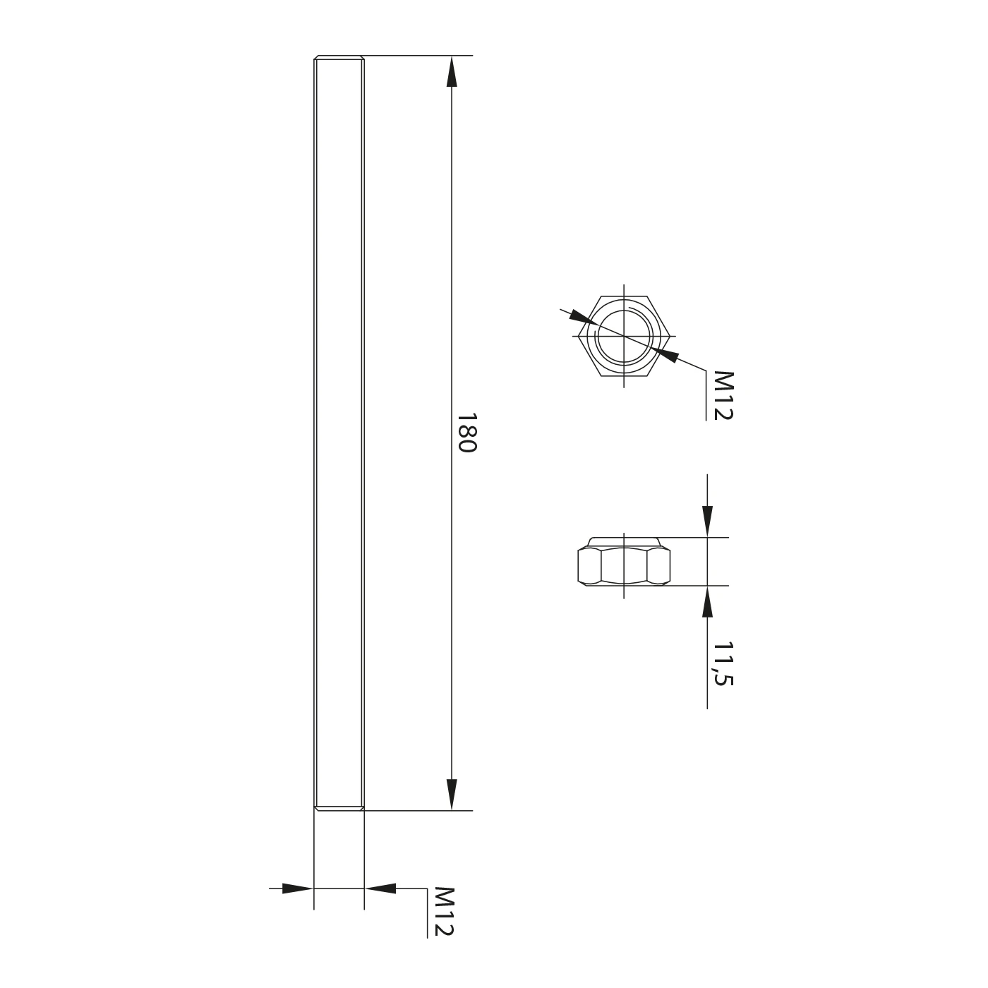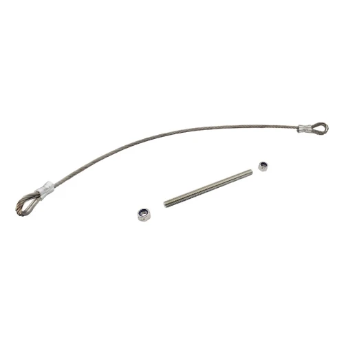 Das Set ist montagebereit — es enthält ein Stahlseil mit werksseitig gepressten Ösen an beiden Enden, eine Gewindestange M12 mit einer Länge von 180 mm sowie zwei selbstsichernde Muttern M12. Dadurch muss der Installateur keine separaten Verbindungselemente zusammenstellen, was die Auftragsausführung beschleunigt.
