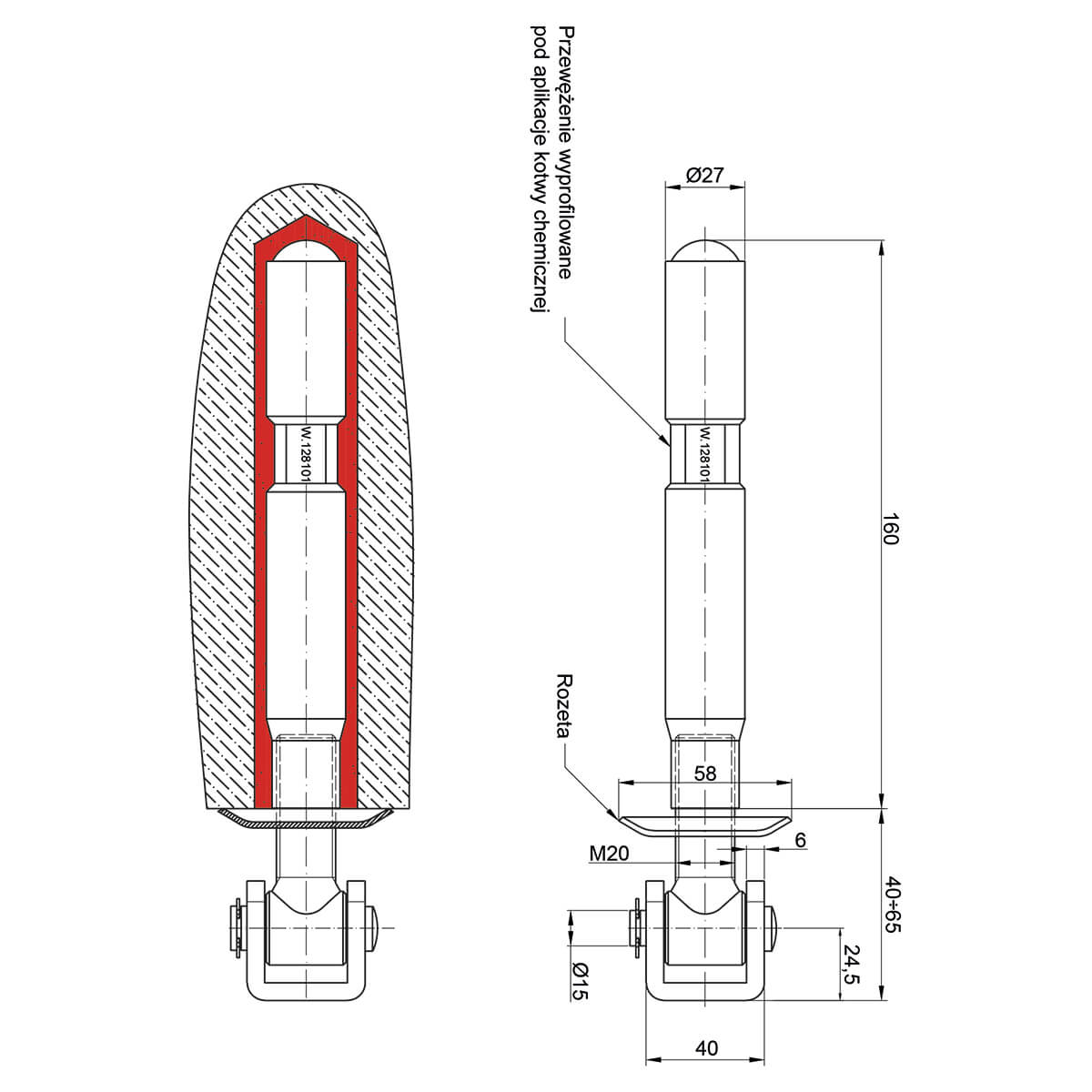 Das Set enthält einen Anker mit einer Länge von 160 mm und einem Durchmesser von Ø 27 mm mit Innengewinde M20 sowie ein komplettes verstellbares Scharnier M20 mit Rosette. Der Verstellbereich des Scharniers beträgt 40–65 mm, was eine präzise Einstellung der Position des Tor- oder Türflügels nach der Montage des Ankers ermöglicht. Die Rosette mit einem Durchmesser von 58 mm verdeckt den Befestigungspunkt und verleiht der Installation ein ästhetisches, fertiges Aussehen.