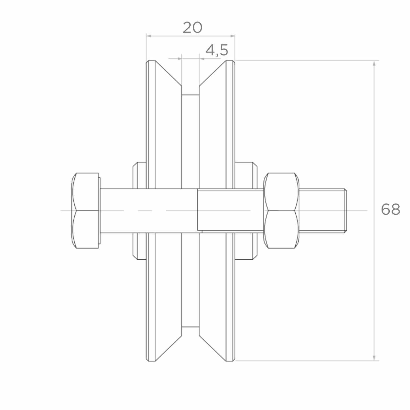 Der Rollenquerschnitt zeigt das V-Nutprofil mit einer Grundbreite von 4,5 mm, das präzise mit der Führungsschiene zusammenarbeitet. Die Rolle mit einem Durchmesser von 68 mm und einer Breite von 20 mm gewährleistet optimalen Kontakt mit der Schiene und minimiert Verschleiß und Geräusche beim Verschieben des Tores. Das Kugellager garantiert niedrige Rollwiderstände auch bei voller Belastung.