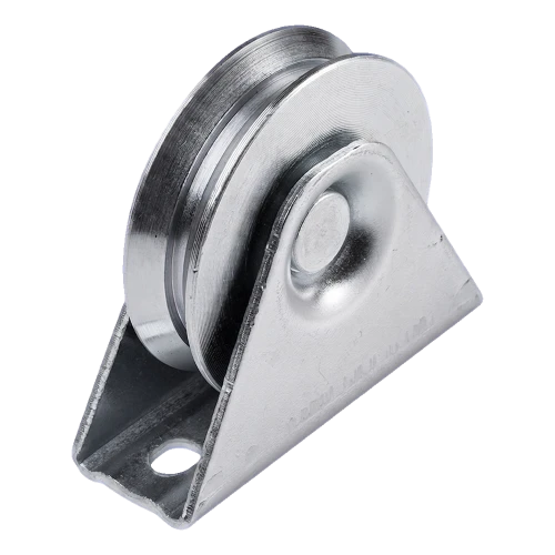 Stahl-Laufrolle mit V-Nut für Schienenlauftore. Die Konstruktion aus verzinktem Stahl gewährleistet hohe Korrosionsbeständigkeit und jahrelangen störungsfreien Betrieb unter Außenbedingungen. Die Rolle ist in einer massiven Montagehalterung gelagert, was eine stabile Führung des Tores auf der Laufschiene garantiert.