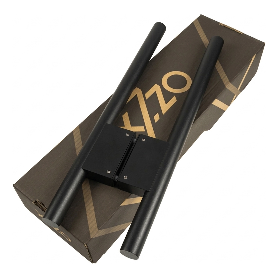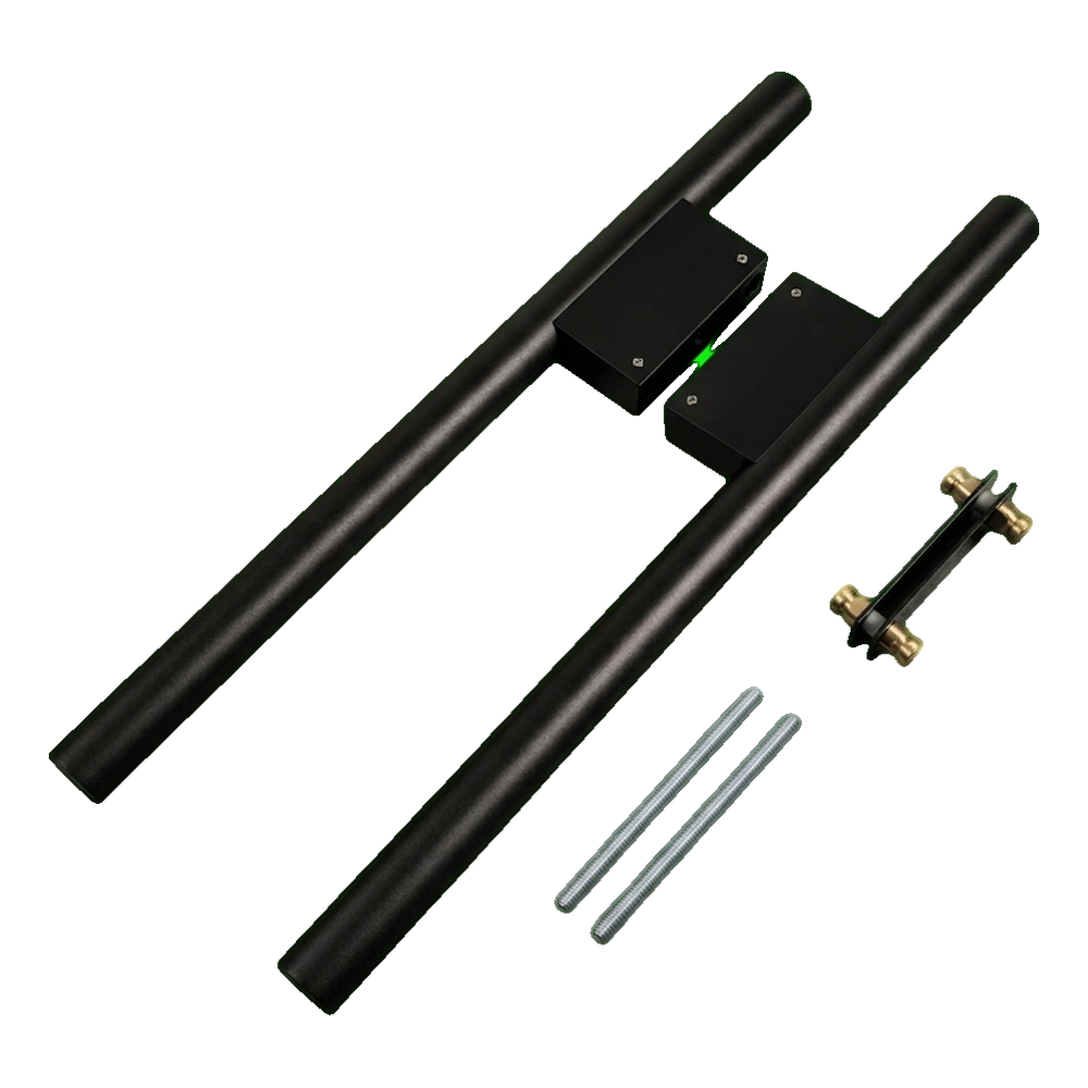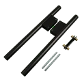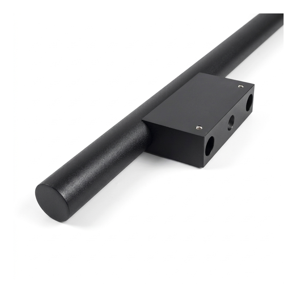 Die aus Aluminium gefertigte Halterung verfügt über präzise gefräste Durchgangslöcher für Gewindestäbe M8. Die Verbindung der beiden Halterungshälften gewährleistet eine steife und stabile Befestigung an den Türen. Die gesamte Konstruktion ist mit einer einheitlichen schwarzen matten Beschichtung versehen, die Stahl- und Aluminiumelemente zu einem visuell stimmigen Ganzen verbindet.