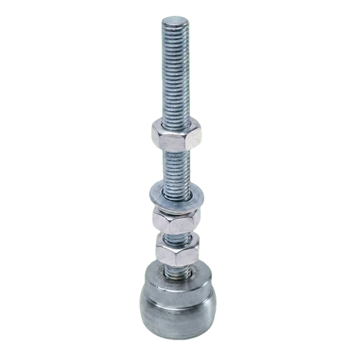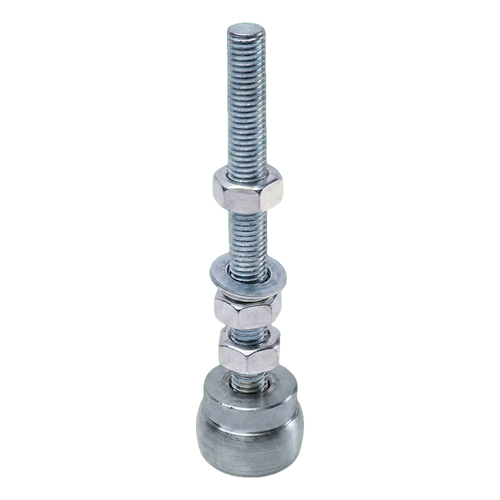 Die Führung besteht aus einem Gewindestift M12 mit zwei Muttern und Unterlegscheiben, die eine Höhenverstellung und sichere Befestigung im unteren Torprofil ermöglichen. Der untere Teil ist mit einer Stahlführungsrolle mit 25 mm Durchmesser ausgestattet, die sich in der unteren Schiene bewegt und den Torflügel auf der richtigen Spur hält. Dank der Gewindeverstellung kann der Installateur das Spiel zwischen Rolle und Schiene präzise einstellen – was sich in einen leisen und gleichmäßigen Torlauf übersetzt.