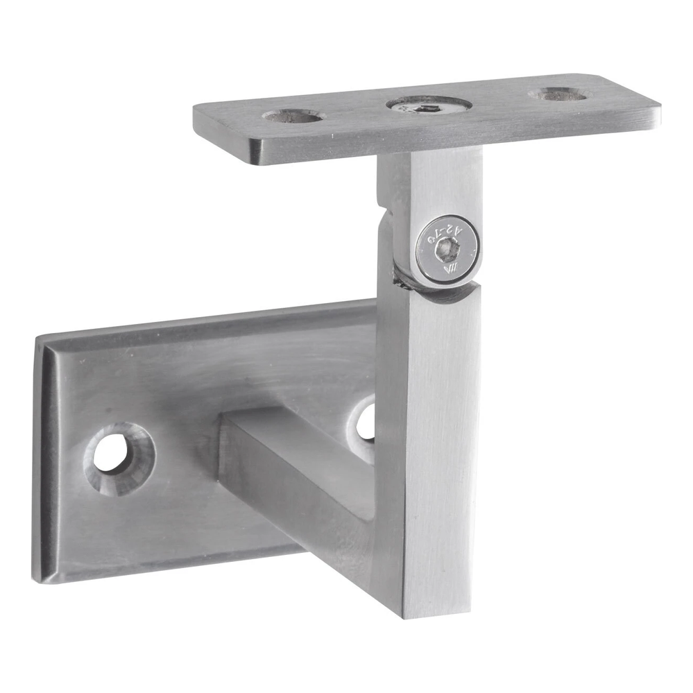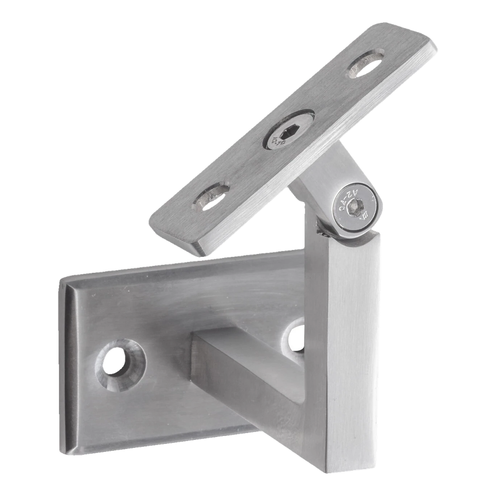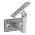 Gelenkiger Handlaufhalter zur Wandmontage für professionelle Geländersysteme aus Edelstahl mit satinierter Oberfläche. Dank des verstellbaren Gelenks der oberen Montageplatte ermöglicht der Halter eine stufenlose Regulierung des Handlaufneigungswinkels — eine unverzichtbare Lösung bei der Montage von Treppengeländern, bei denen der Steigungswinkel der Treppe eine präzise Anpassung erfordert.