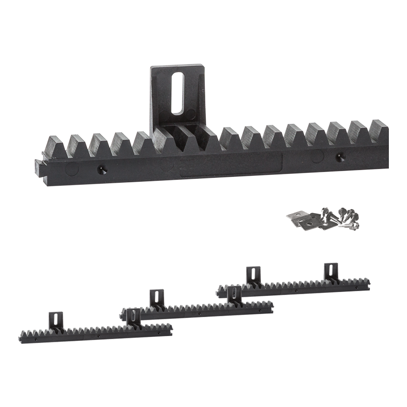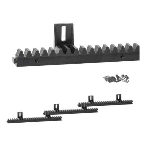 Das Set enthält drei Abschnitte der Zahnstange mit einer Länge von jeweils 333 mm, die mittels Verbindungsschlössern miteinander verbunden werden – dadurch erhalten Sie schnell eine durchgehende Zahnlinie mit einer Gesamtlänge von 999 mm. Im Lieferumfang finden Sie auch selbstbohrende Schrauben mit Unterlegscheiben, die eine schnelle Montage ohne Vorbohren ermöglichen. Jeder Zahnstangenabschnitt ist mit zwei Befestigungshaltern ausgestattet, was eine sichere und einfache Verschraubung am Torflügel gewährleistet.