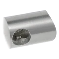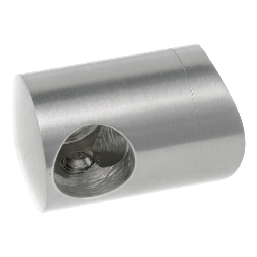 Das zylindrische Gehäuse verfügt über eine durchgehende Bohrung für Stab fi 12 mm, zwei Löcher für Klemmschrauben zur sicheren Arretierung des Stabes sowie ein zentrales Montageloch fi 6,5 mm zur Befestigung am Pfosten. Die bogenförmig profilierte Grundplatte passt sich ideal der Krümmung des Rohres fi 42,4 mm an, was eine stabile und dichte Anlage ohne zusätzliche Bearbeitung gewährleistet.