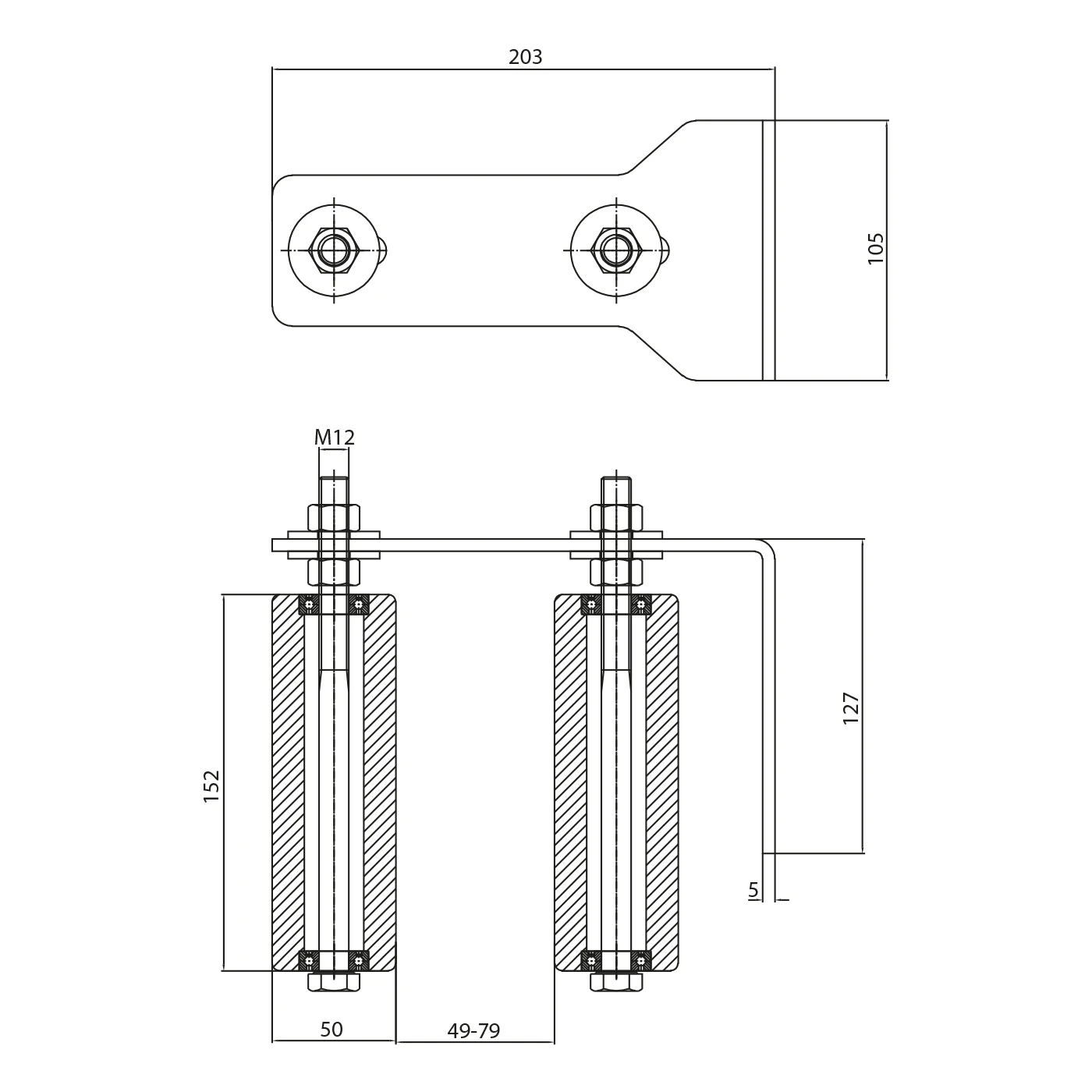 - Robuste Konstruktion — 5 mm Blech und M12 Schrauben übertragen erhebliche Lasten