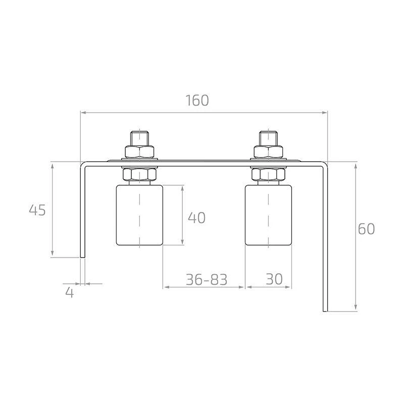 Die verstellbare obere Führung PSG ist ein montagefertiges Stabilisierungselement für Schiebetore. Der Halter ist mit zwei weißen Kunststoffrollen ausgestattet und gewährleistet eine reibungslose und leise Führung des Torflügels beim Öffnen und Schließen. Dank der verstellbaren Rollenabstand im Bereich von 36–83 mm passt sich die Führung an geschlossene Profile verschiedener Breiten an, was sie zu einer universellen Lösung für viele Tortypen macht.