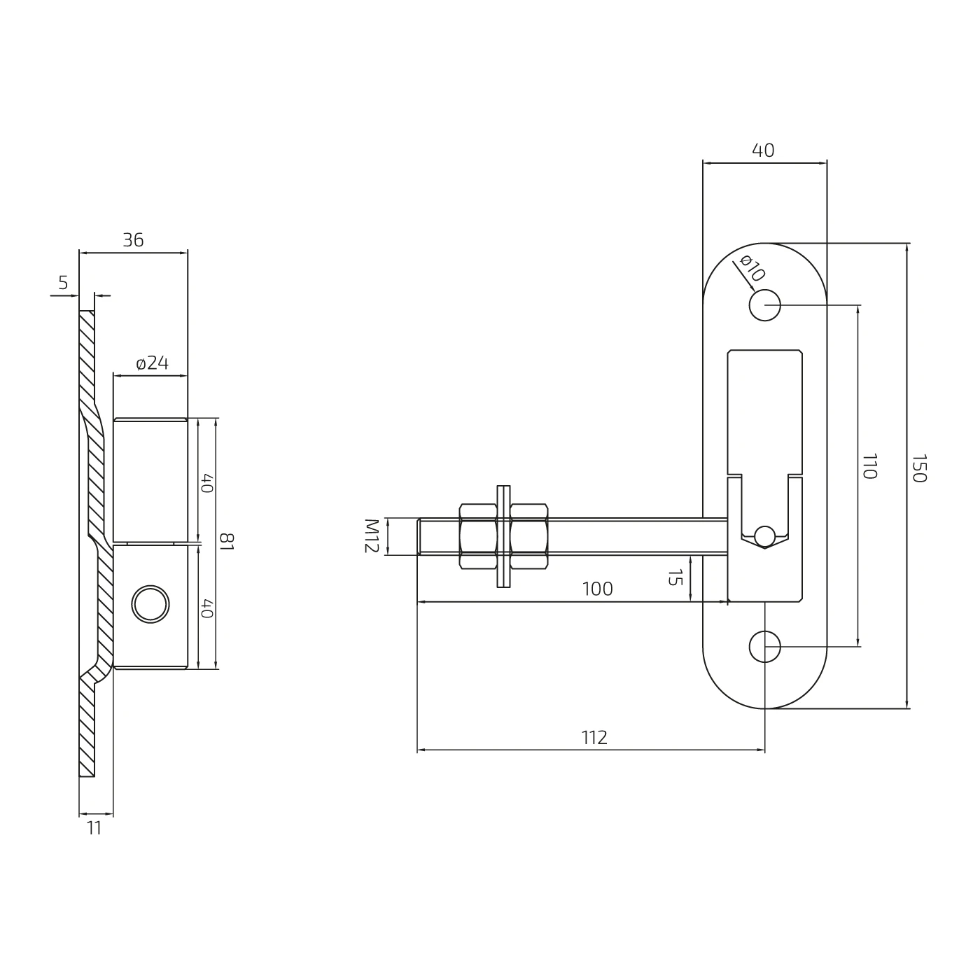 Das Schild mit den Abmessungen 150 × 40 mm und zwei Montagelöchern (ø10 mm, Lochabstand 110 mm) gewährleistet eine stabile, sichere Befestigung am Pfosten. Die Kugel im Scharnier garantiert einen reibungslosen Betrieb des Torflügels und minimiert die Reibung, was sich in Bedienkomfort und Langlebigkeit des gesamten Mechanismus niederschlägt. Die zulässige Belastung pro Scharnierpaar beträgt 250 kg, wodurch es sich auch für schwere Stahlkonstruktionen eignet.