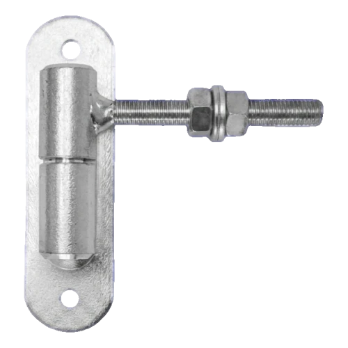 Verstellbares Rollscharnier aus Stahl mit Kugel und Montageschild – zuverlässige Lösung zum Aufhängen von Gartentoren. Das M12-Gewinde mit Einstellmutter ermöglicht eine präzise Einstellung des Torlots zu jedem Zeitpunkt – sowohl direkt nach der Montage als auch während des Betriebs, wenn die Konstruktion durchhängt oder sich die thermischen Bedingungen ändern.