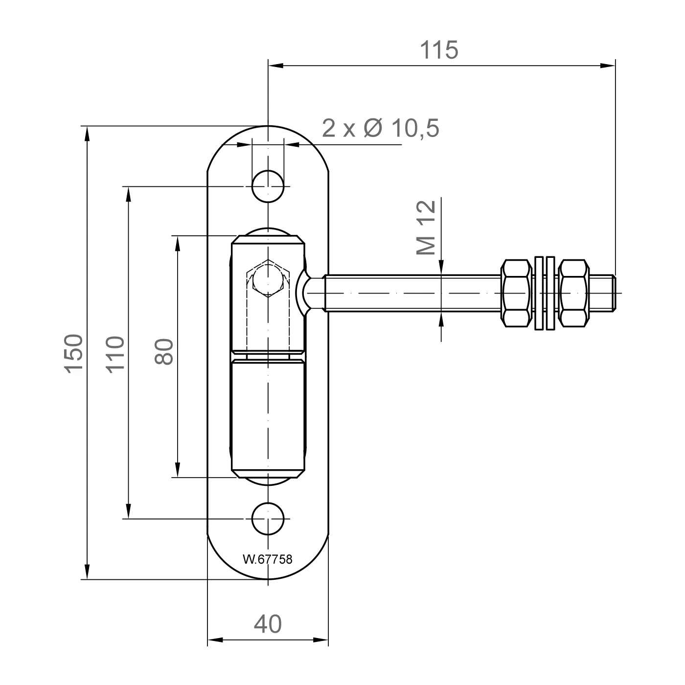 - Länge des Gewindebolzens (von der Drehachse): 115 mm